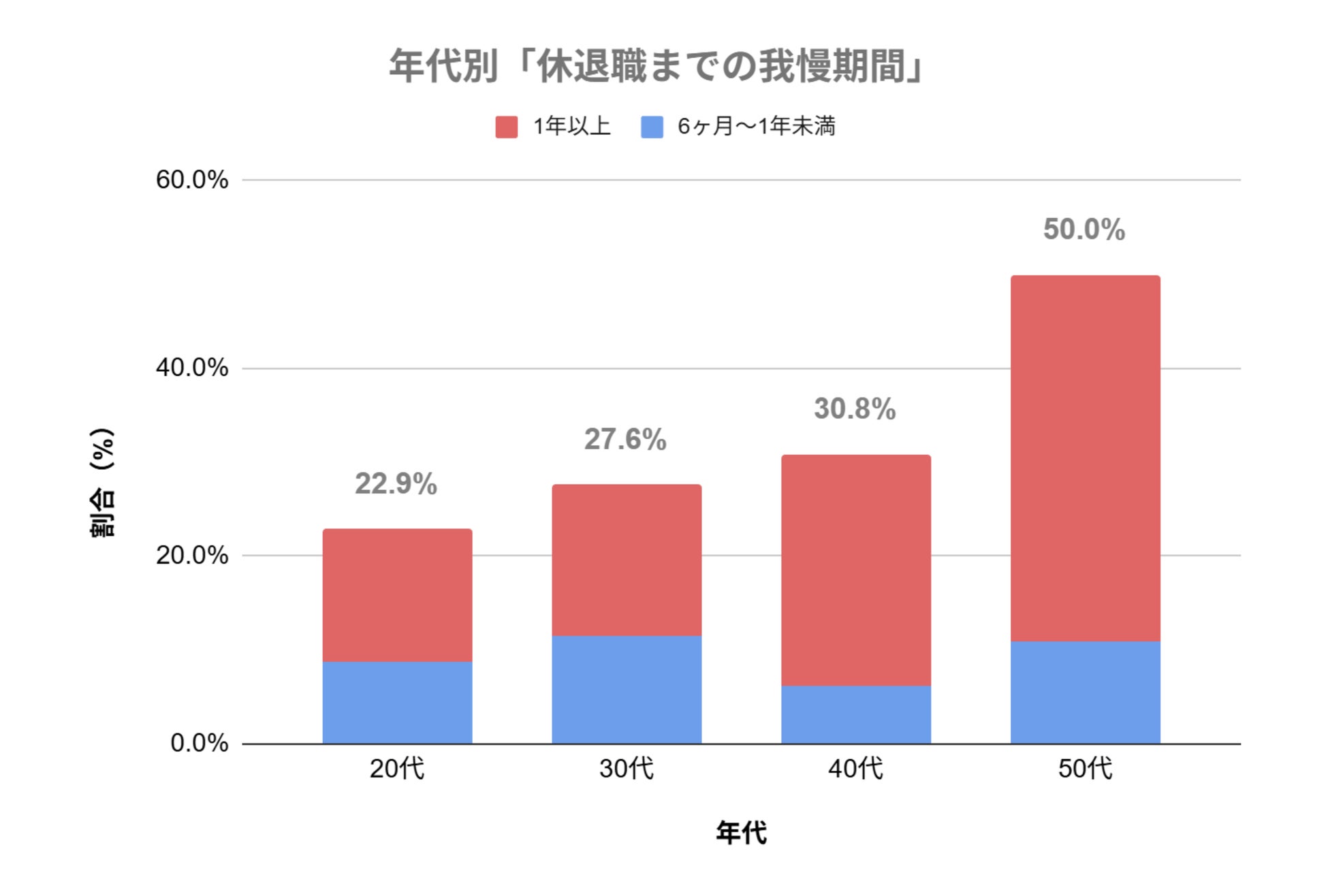 その結果、退職・休職に至るまでの期間において、50代の「1年以上我慢して働き続けた」割合が39.2%と、20代(14.3%)の約2.7倍にのぼることが判明。さらに50代経験者の2人に1人(50.0%)が「半年以上」限界状態で働き続けていたことが明らかになりました。
