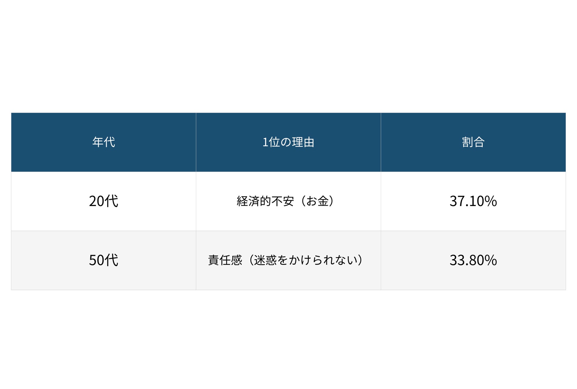 20代は「経済的不安」が最大の理由である一方、50代では「自分が抜けたら職場に迷惑がかかる」という責任感が最大の理由に。