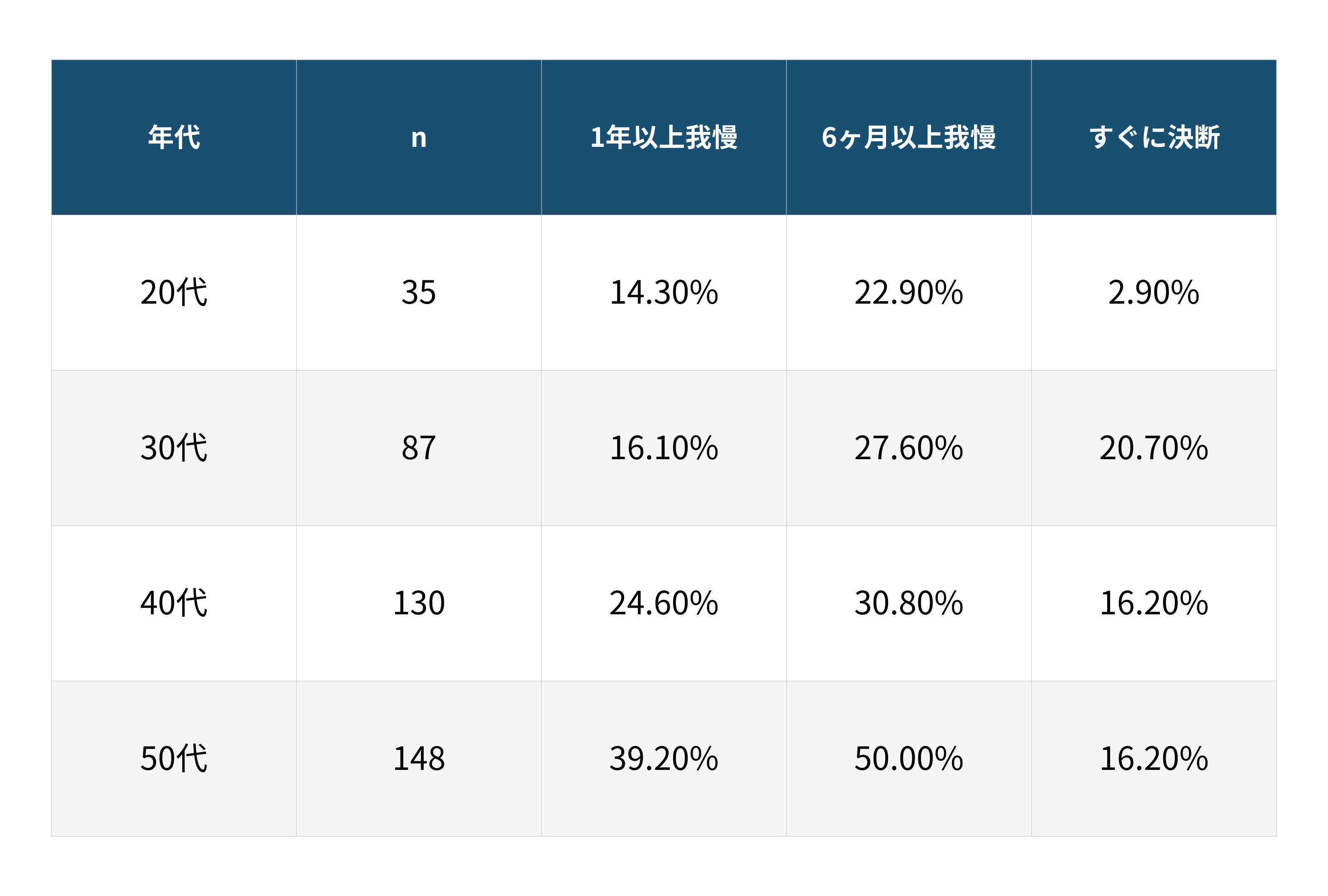 身体や心に異変(不眠、動悸、過度な疲労感など)を感じ始めてから退職・休職を決断するまでの期間を年代別に調査したところ、年齢が上がるほど決断が遅れる傾向が顕著に見られました。