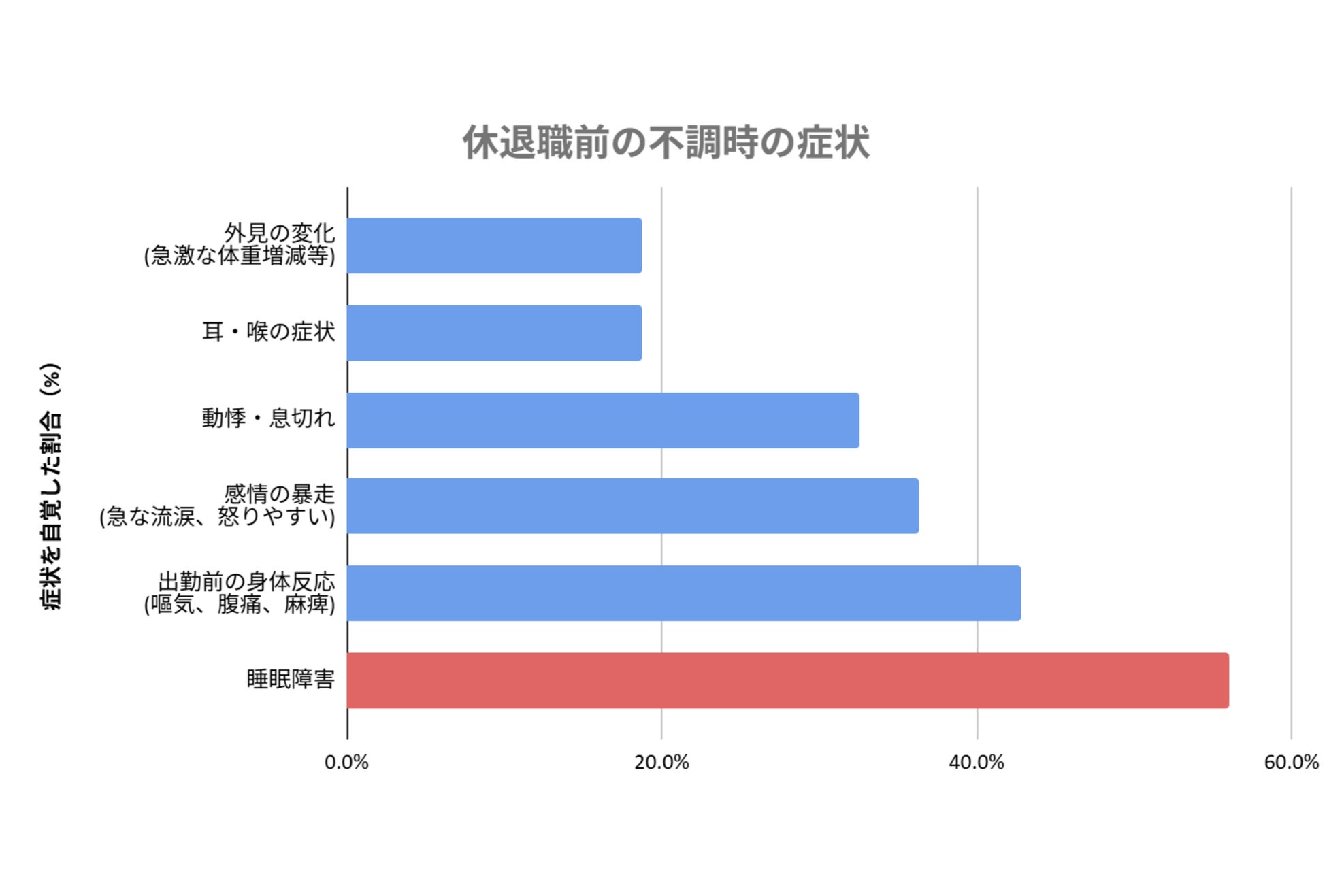 「睡眠障害」は過半数(56%)が経験しており、最も多いSOSサインでした。これらの症状は「気のせい」「疲れているだけ」と見過ごされがちですが、身体からの明確な警告サインです。