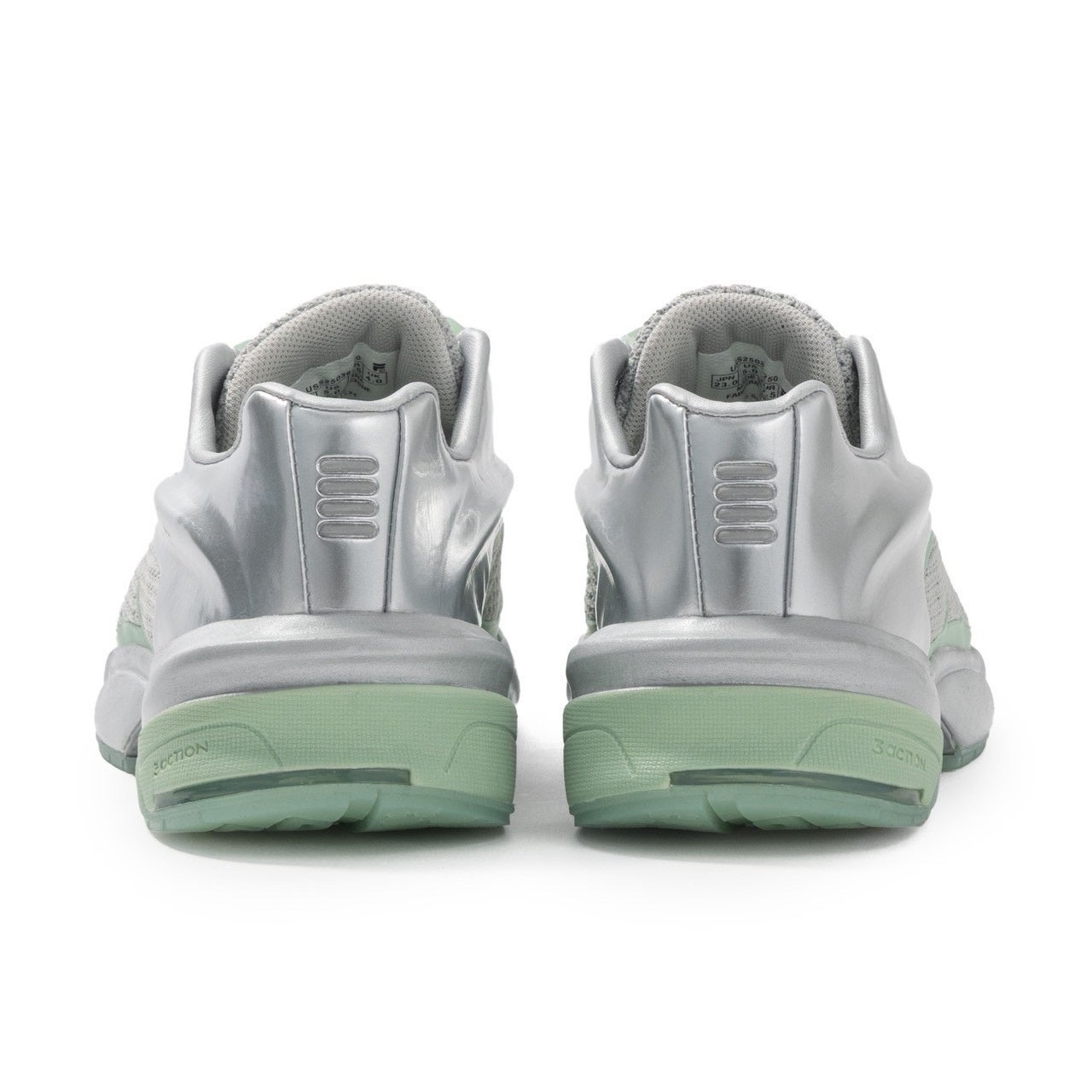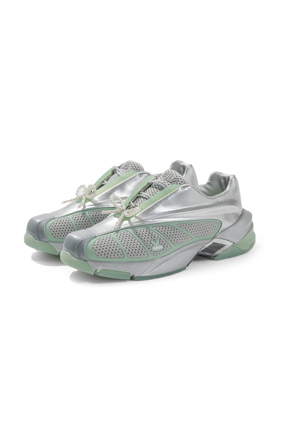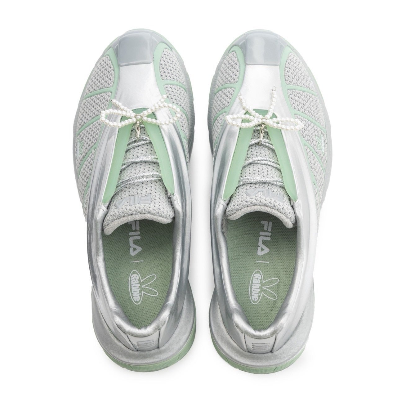 アッパーには、Rena のアイコンカラーであるミントグリーンを軸に、シルバーのメタリックトーンを掛け合わせた近未来的なカラーリングを採用。アクセントとして添えられたパールのリボンチャームは取り外し可能で、スタイリングに合わせて自由にアレンジできます。サイドには Rena ファンの呼称“RABBIE(ラビ―)”のロゴを刻み、ファンにとっても特別な一足に仕上げました。