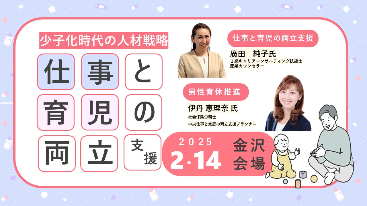 厚生労働省委託事業 キャリア形成・リスキリング推進事業は、この度、令和6年度中小企業育児・介護休業等推進支援事業(厚生労働省委託事業)と共催し、2月14日(金)に石川県金沢市にて「仕事と育児の両立支援セミナー」を実施します。