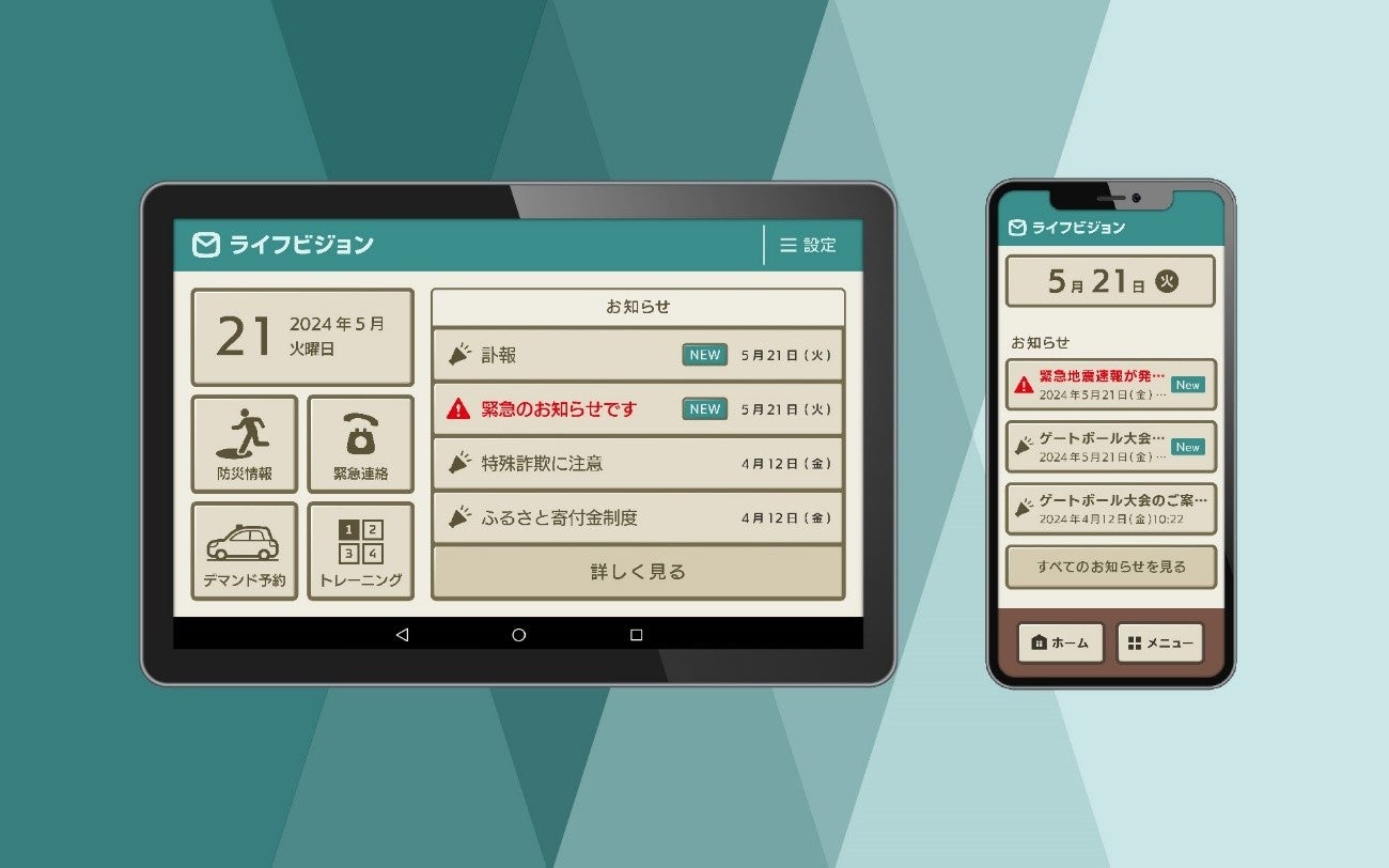 自治体が購入し、住民が利用する地域情報サービス。自治体職員が情報を入力・配信するCMSと、住民がお知らせを閲覧するアプリケーションで構成。スマートフォンを使用しない高齢者向けに、世帯ごとの専用タブレット端末を配布するプランも提供し、誰でも簡単に利用できる仕組みを整えている。デジタル技術を活用した双方向の情報提供により、地域の各種サービスとの連携を強化し、地域活性化に貢献。2014年のサービス開始より、住民と自治体をつなぐプラットフォームとして、より便利で安心な暮らしをサポートしている。