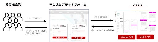 トランスコスモスが運営する法人向け申し込みサイト経由でAdaloライセンスを購入いただくことで、初期手続きや毎月の請求書の発行処理をトランスコスモスが対応し、お客様企業のAdalo導入時の負担を軽減します。