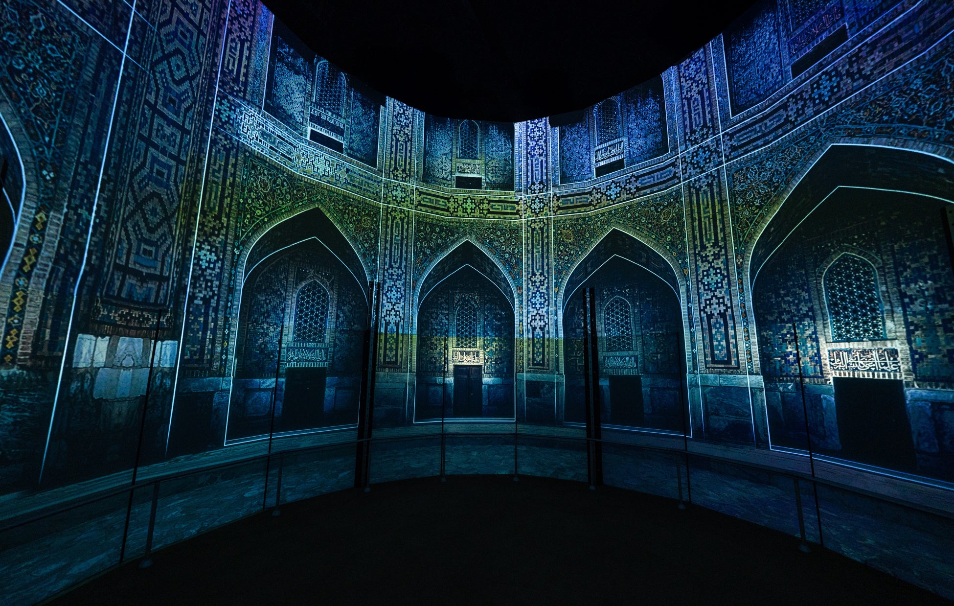 展示のハイライトは、上昇するプラットフォーム内における 360 度のマルチメディアの旅です。わずか3分強の間に、プロジェクションとサウンドスケープが来場者をウズベキスタンの変容に没入させ、「知の庭」への到着を準備させます。この動くプラットフォームは、デザインや機能的にもユニークなもので、日本ではこれまで見られたことがない内容です。