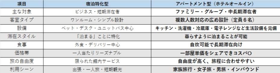 以下は、一般的な宿泊特化型ホテルとHOTEL ALL INブランドの違い・強みをわかりやすく