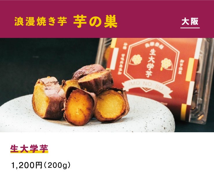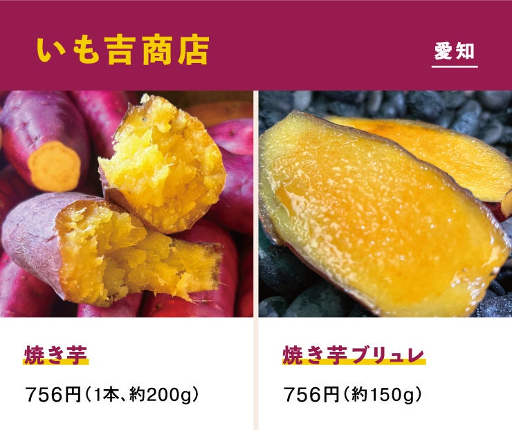 [福島]会津串鶴 / [群馬]&potato® / [愛知]いも吉商店 / [群馬]芋福堂 / [静岡]oimo&coco. / [京都]京都芋屋 芋と野菜 / [兵庫]神戸芋屋 志のもと / [宮崎]sweet&healthy SAZANKA / [福井]フランダースフリッツ / [茨城]干し芋専門店 ほしいもの百貨 / [岐阜]蜜芋処 ~えんむすび~ / [大阪]浪漫焼き芋 芋の巣 / [長野]よっしーのお芋屋さん。