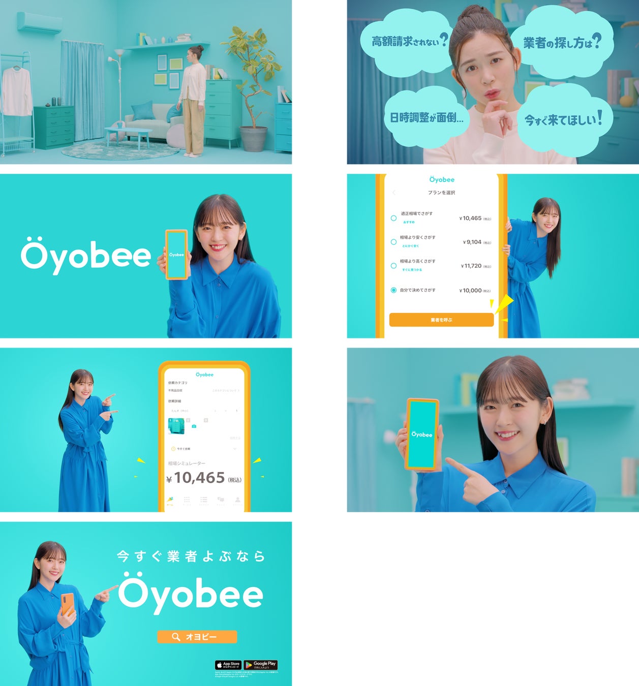 1人暮らしの女性が自身の部屋で不用品の処分に悩んでいるシーンから本編が開始。「業者の探し方は..?」や「高額請求されないか」といった不用品処分に対する様々なお悩みや懸念が浮かんでいる様子です。すると、オヨビーのアプリロゴにも採用されているターコイズブルーの空間にシーンが切り替わり、鈴木愛理さんが登場。「そんな時、オヨビーならすぐに業者が来てくれる!」と明るく朗らかな印象で伝えます。その後、鈴木さんの隣に大きなスマホ画面が浮かび上がり、くらしにまつわる様々なサービスの予算相場が確認できる「相場シミュレーター」や、自身の予算を入力することで理想の業者探しができるといったオヨビーの操作イメージを、画面の周りでナレーションとともに紹介します。スマホ画面上の「業者を呼ぶ」ボタンがクリックされ、鈴木さんが「すると!」と言ったところで、1人暮らしの女性の部屋にシーンが戻り、女性のもとに作業服を着た業者の男性が駆けつけます。最後は、部屋に音楽が鳴り始め、鈴木さんも加わった3人が「♪くらしの悩み アプリでポチり!すぐに解決」とオヨビーの魅力をダンスで表現します。鈴木さんのシーンごとに変わる可愛らしい表情と、耳に残りやすいキャッチ―な音楽に乗せた歌唱・ダンスにご注目ください。