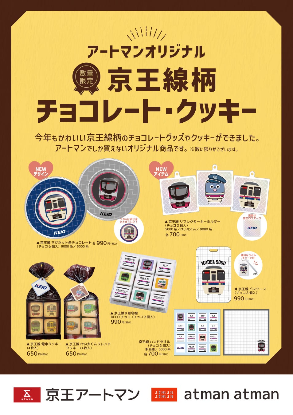 京王グループでコスメを中心に生活雑貨を販売する株式会社京王アートマン(本社:東京都多摩市、以下 京王アートマン)は、2月1日(土)より京王アートマン 聖蹟桜ヶ丘店・府中店、アートマン アートマン 多摩センター店・コスメ調布店にて京王アートマン オリジナル 京王線柄チョコレート・クッキーを販売しております。京王アートマンでしか買えないオリジナル商品です。