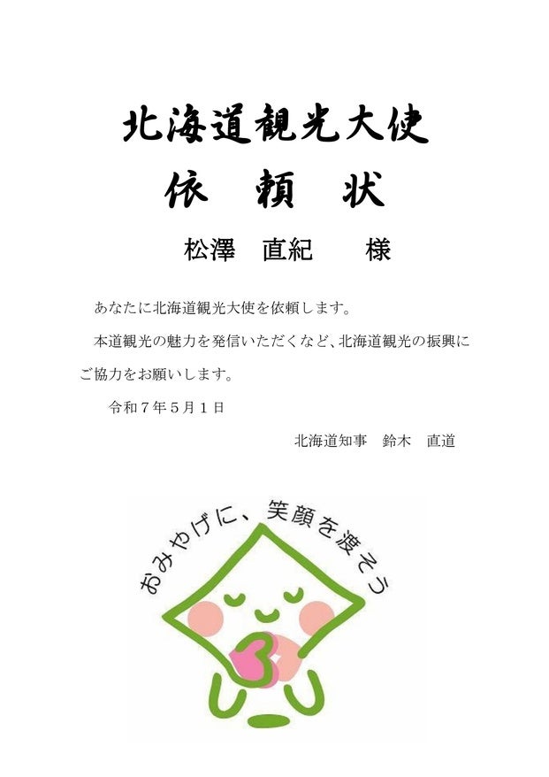 北海道知事が各分野で活躍する著名人や事業者、団体に委嘱し、観光イベントやメディア出演、SNS発信、講演活動などを通じて、北海道のブランド力向上や観光客誘致、地域活性化に貢献します。