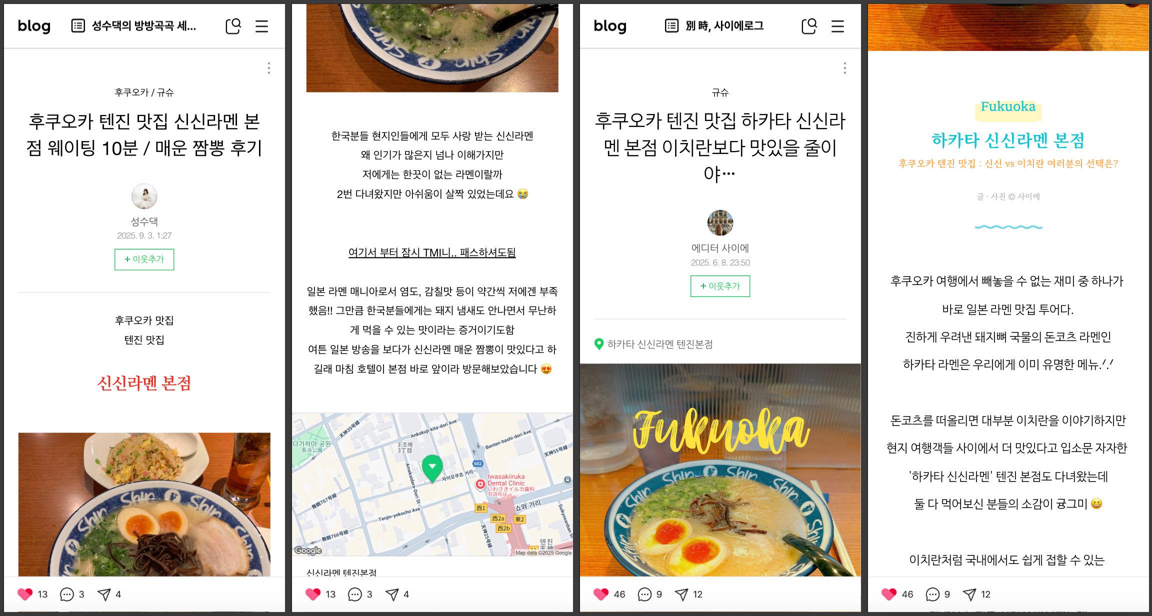 韓国での集客を考えるうえで、GoogleとNAVERの検索結果は大きく異なります。実際に同じ検索キーワードで比較すると、その違いが一目で分かります。例えば「福岡 ラーメン」で検索した場合がその一例です。