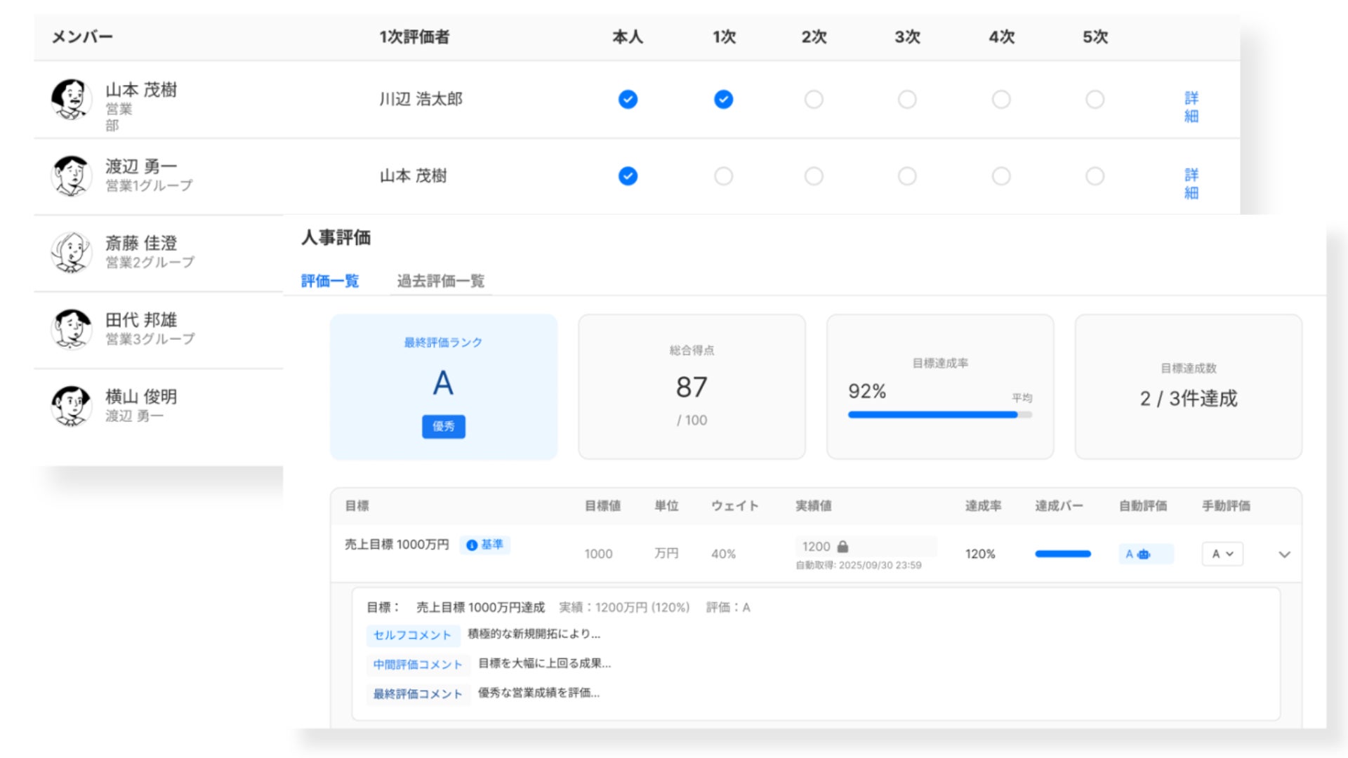 目標管理のリスト表示機能では、組織全体から個人まで全ての目標を一覧で確認できます。進捗状況がひと目でわかるため、遅れている目標の早期発見や優先順位の調整が容易になり、効率的な目標管理を実現します。