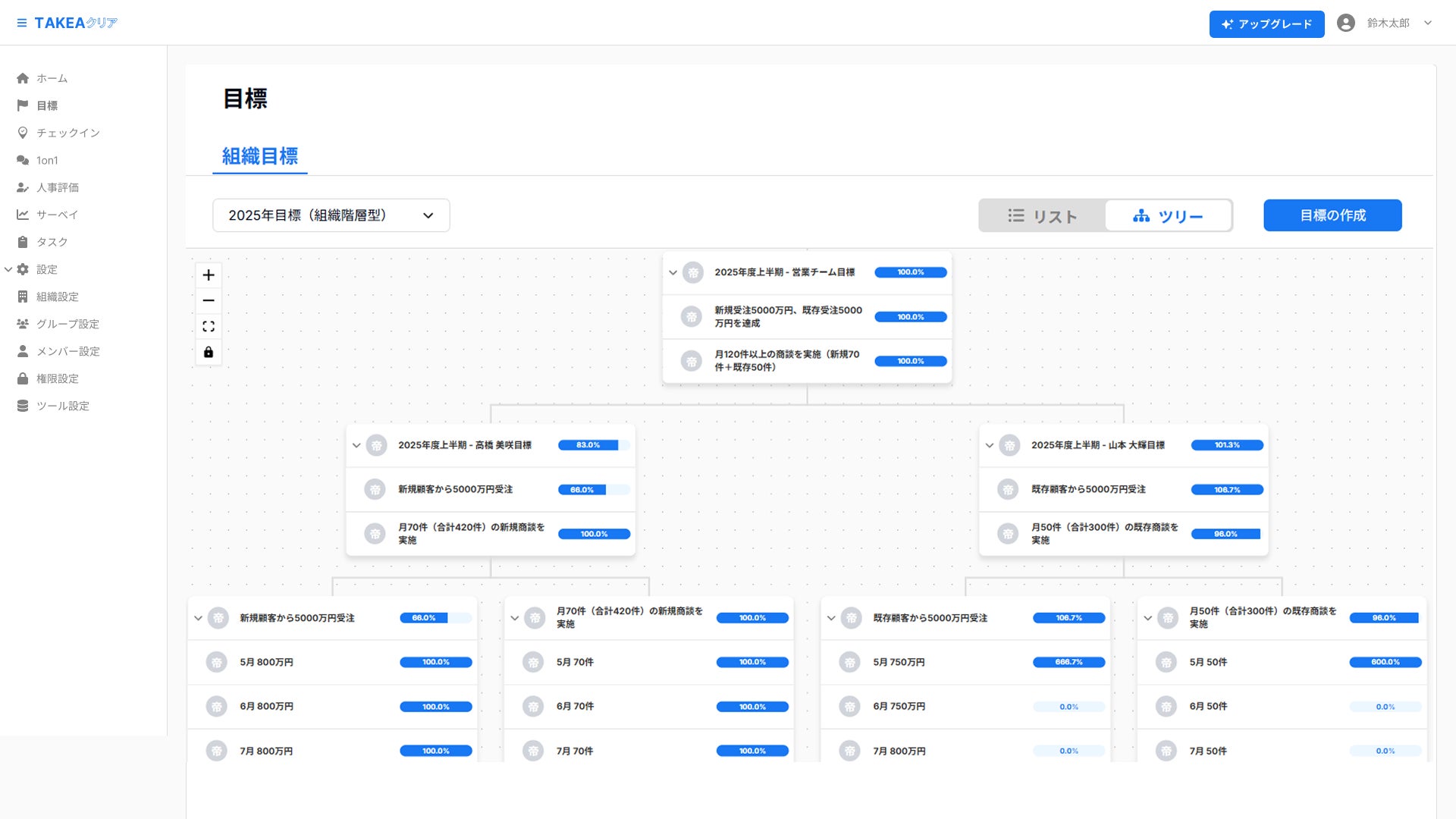目標管理のツリー表示機能では、組織目標から部署目標、個人目標までの階層構造を可視化します。上位目標と下位目標の連携が明確になることで、各メンバーが自分の役割と組織全体への貢献を理解し、一体感のある目標達成を促進します。