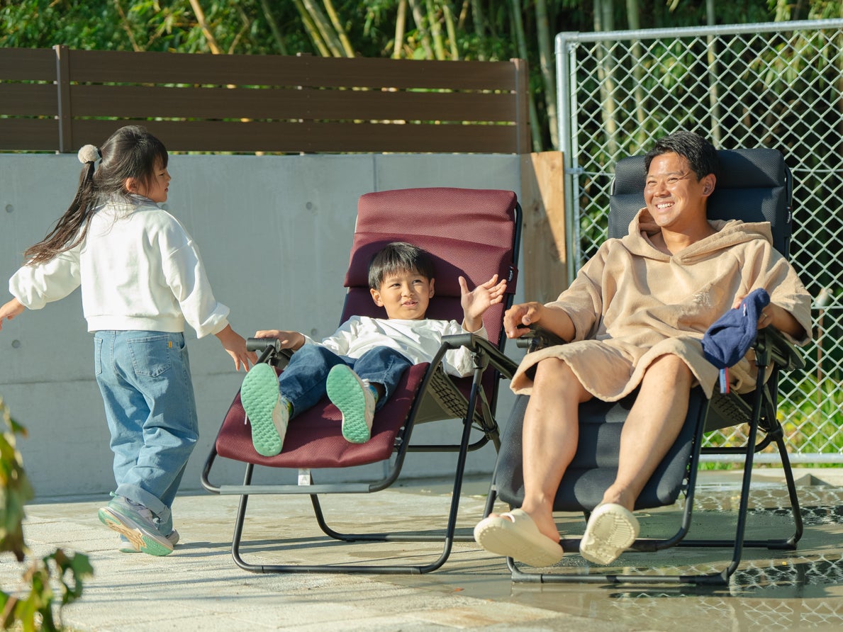 サウナでたっぷりと汗を流した後は、特大サイズの露天水風呂で全身をリフレッシュ。その後はブランコに乗り、心地よい浮遊感を感じ、楽しさと風を感じ極上のリラックスが体験できます。更に、深い安らぎを与えるラフマ(フランス)の無重力チェアーも、クールダウン効果を最大限に引き出します。まるで体が宙に浮いているかのような座り心地が、全身の力を自然と抜き去ります。