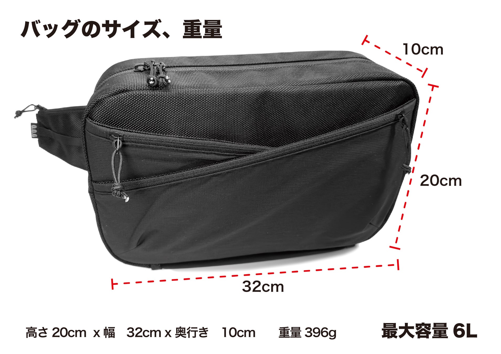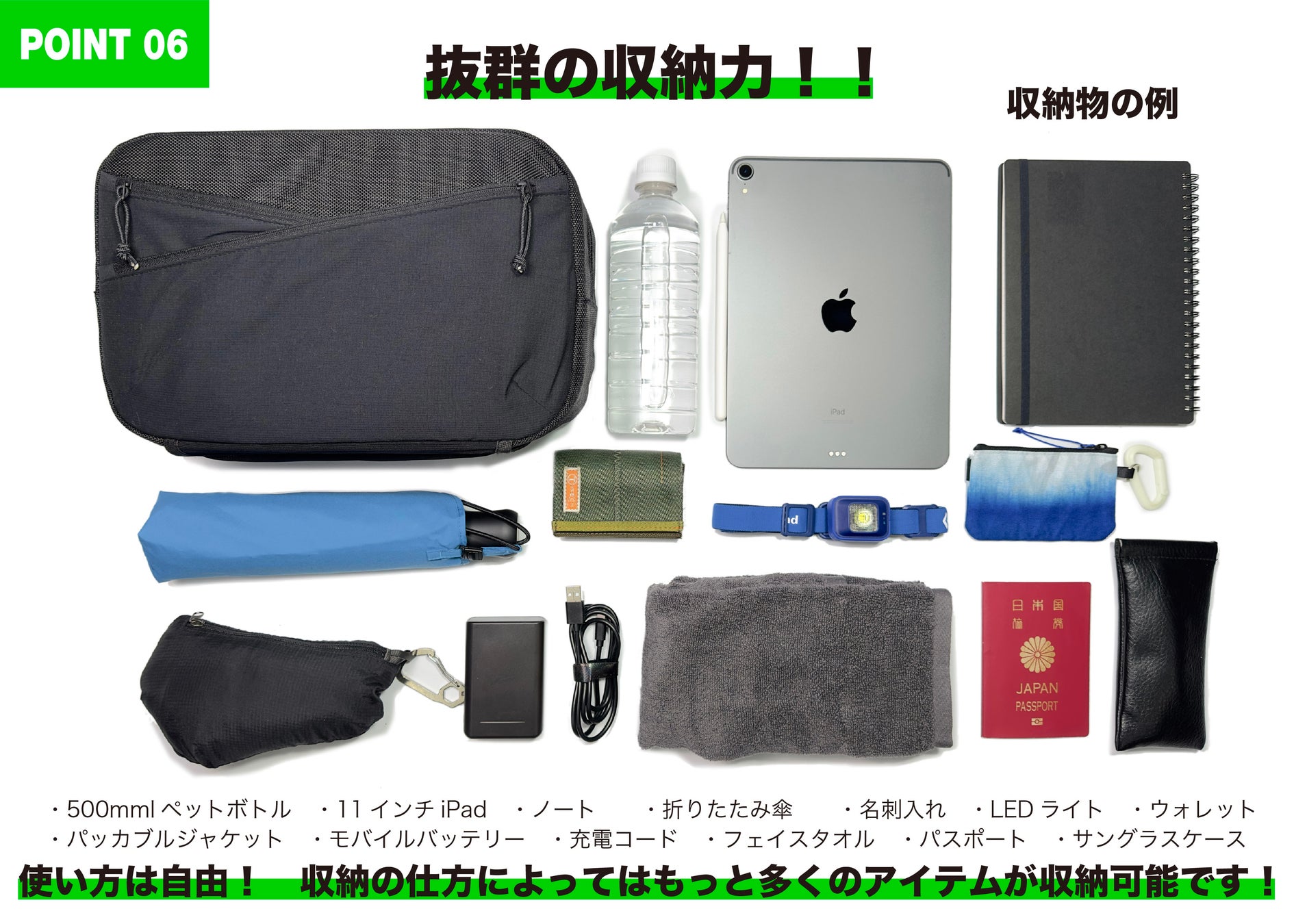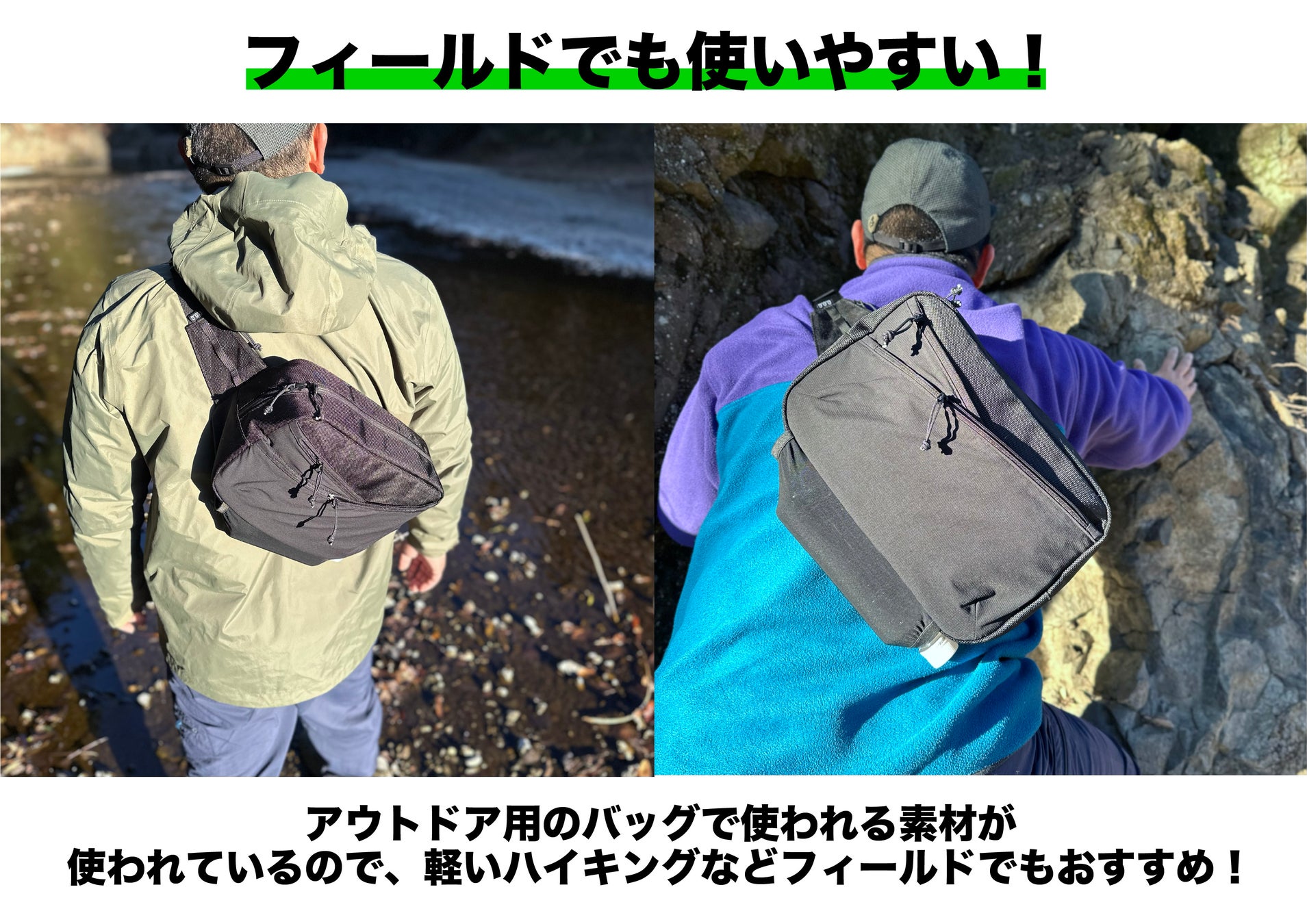 ちょっとした外出時にバックパックだと大きすぎる、サコッシュ、ポーチでは小さすぎる、そんなときに外出に時に困らない十分なアイテムを収納できるバッグが欲しい、そんな思いからデザインされたバッグ。