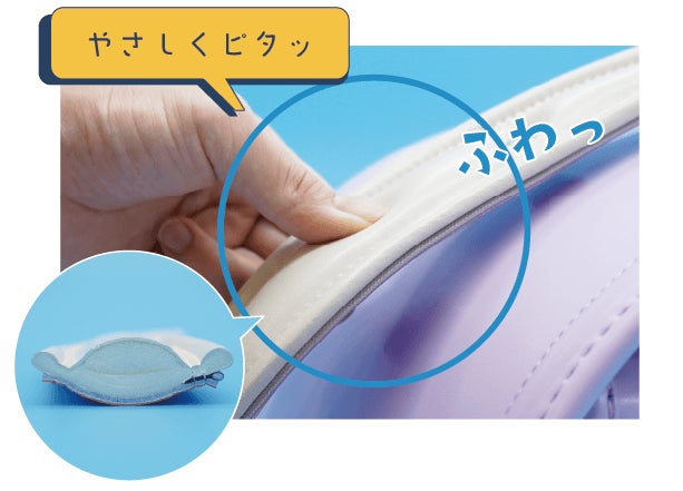 肩ベルトが「らくふわベルト®」としてリニューアルしました。クッション厚が230%(※)アップし、より優しい使い心地に。低反発性のウレタン10㎜を使用し、端までしっかりとクッションを入れることによって肩に食い込みにくい構造になっています。「らくふわベルト®」は、ほぼ全てのEISHINランドセルに搭載されています。
