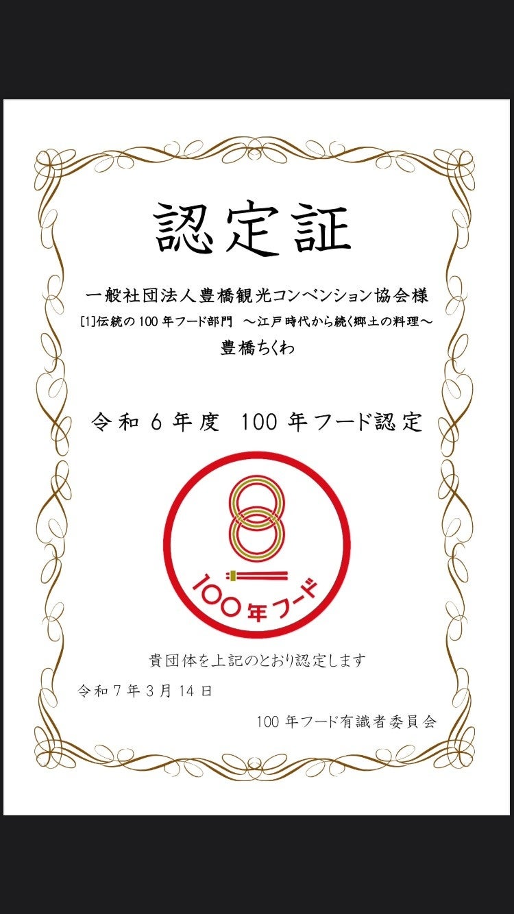 「豊橋ちくわ」が、令和6年度の文化庁「100年フード・伝統の100年フード部門~江戸時代から続く郷土の料理~」として認定されました。この認証制度は、日本の多様な食文化の継承・振興への機運を醸成するために、文化庁が地域で世代を越えて受け継がれてきた食文化を、100年続く食文化「100年フード」と名付け、認証し、その食文化の継承を応援する取組のひとつです。