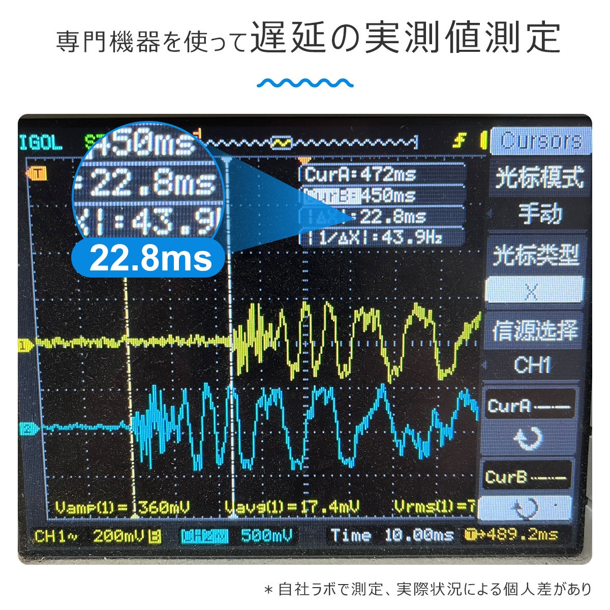 2.4GHzワイヤレスモードで超低遅延に対応。Earakuラボの専用機器で、付属品の「Rena Box」を用いてデバイスと接続した遅延の実測値を測定したところ、わずか22.8msの遅延でした。