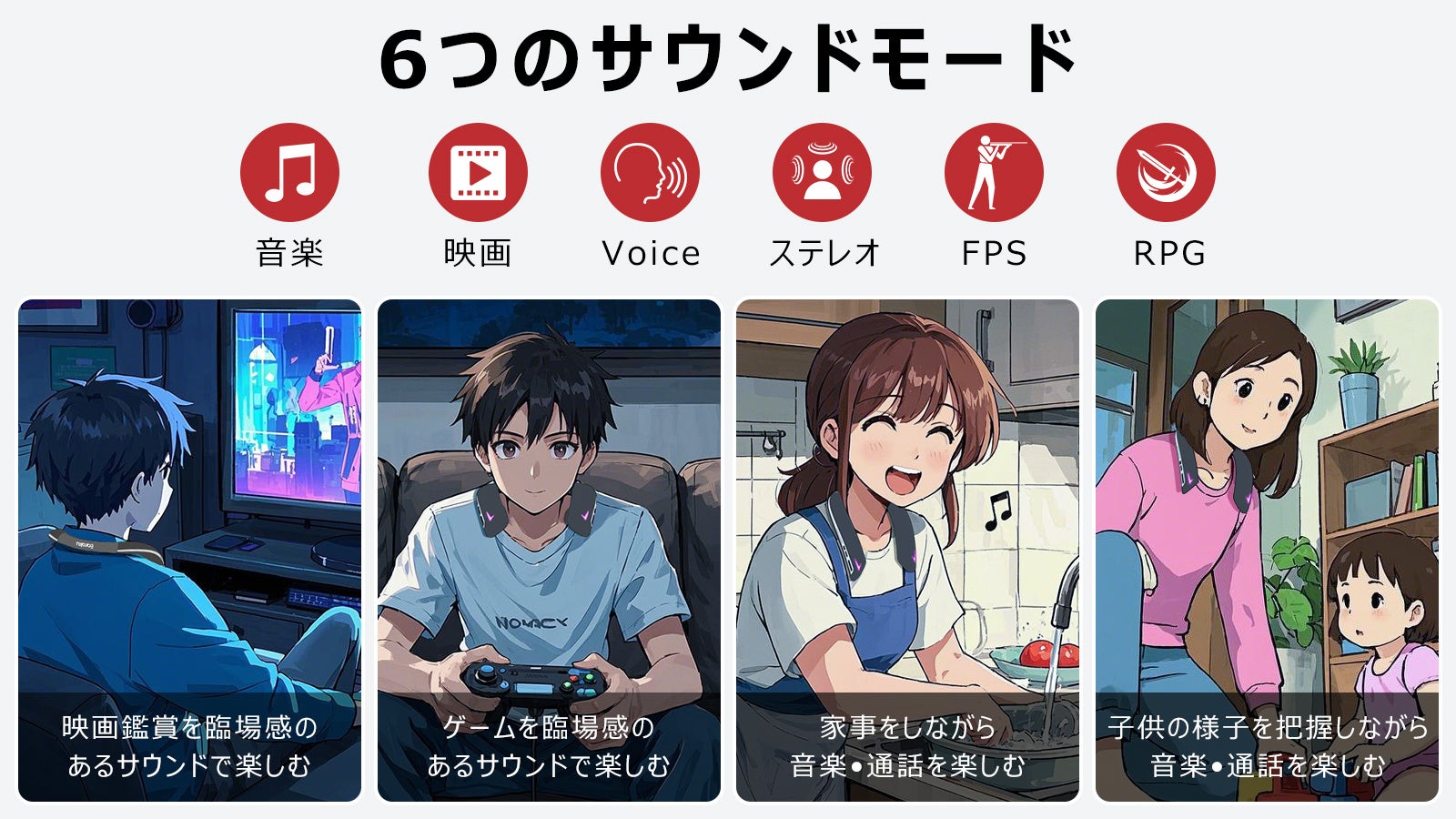 ゲーム用モード3つと映画&音声モード3つで合計6つのモードを搭載し、使用場面によって最適な音の切り替えが可能です。