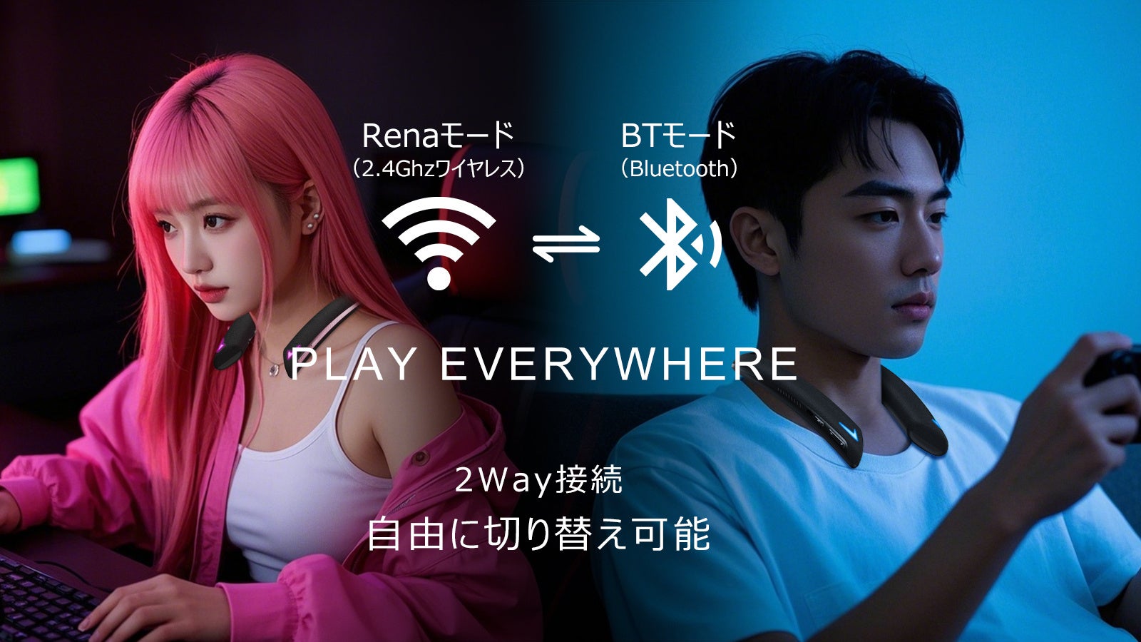 より多くの場面でご使用いただけるよう、Rena Box を用いた2.4GHzワイヤレスモードとBluetoothモードを実装しています。ゲームなど本格的に音を楽しみたい場面はもちろん、気軽に音楽などを聴きたい日常の場面でそれぞれ使い分けることができます。