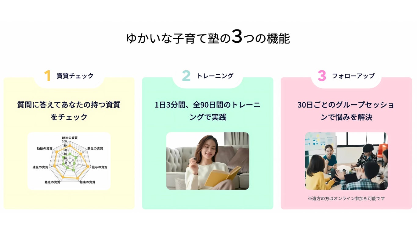 専門家監修による90日間のトレーニングプログラムを、毎日3分間1つの問いに答える簡単なステップで実践できます。具体的なトレーニング内容は、子どもの特性や特定なシーンに合わせた声かけや関わり方などを習得できるものです。