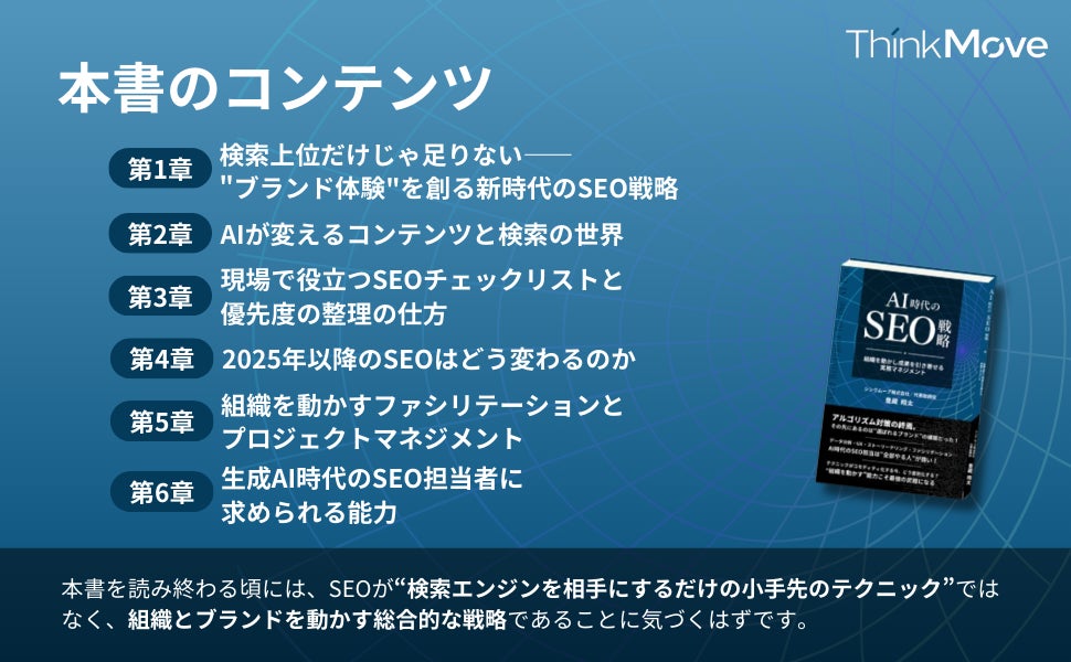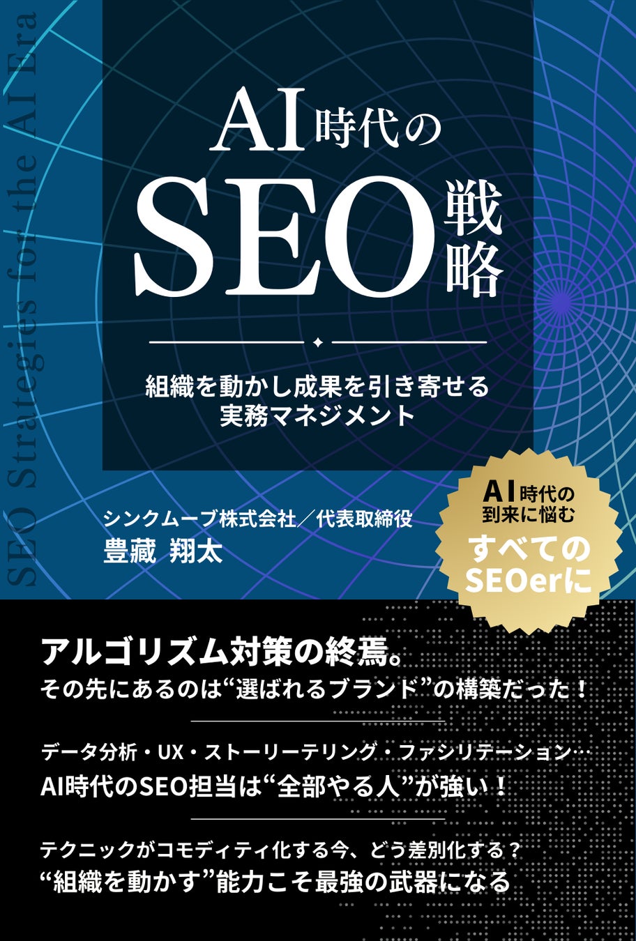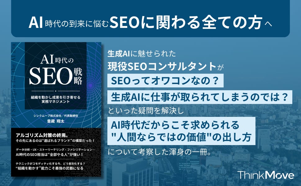 デジタルマーケティング支援・AI活用支援を行うシンクムーブ株式会社(本社:東京都渋谷区、代表取締役:豊藏 翔太)は、組織のブランド戦略と情報体験を軸にした新時代のSEO戦略を解説した書籍『AI時代のSEO戦略――組織を動かし成果を引き寄せる実務マネジメント』を2025年2月3日(月)に刊行いたしました。