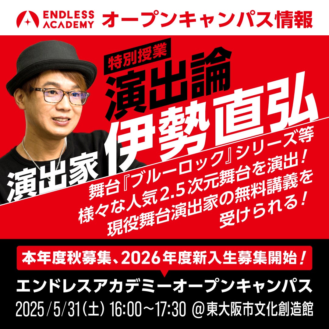 また、本公演を制作しているOfficeENDLESSが運営し、様々な表現をリアルな現場を通して学べ、在校中からオーディションが受けられることなどで注目を浴びている総合芸術学校『エンドレスアカデミー』が、舞台『ブルーロック』のリハーサルの様子や、演出家の話を聞くことができる無料オープンキャンパスを東京・大阪公演にあわせて実施することも決定しました。