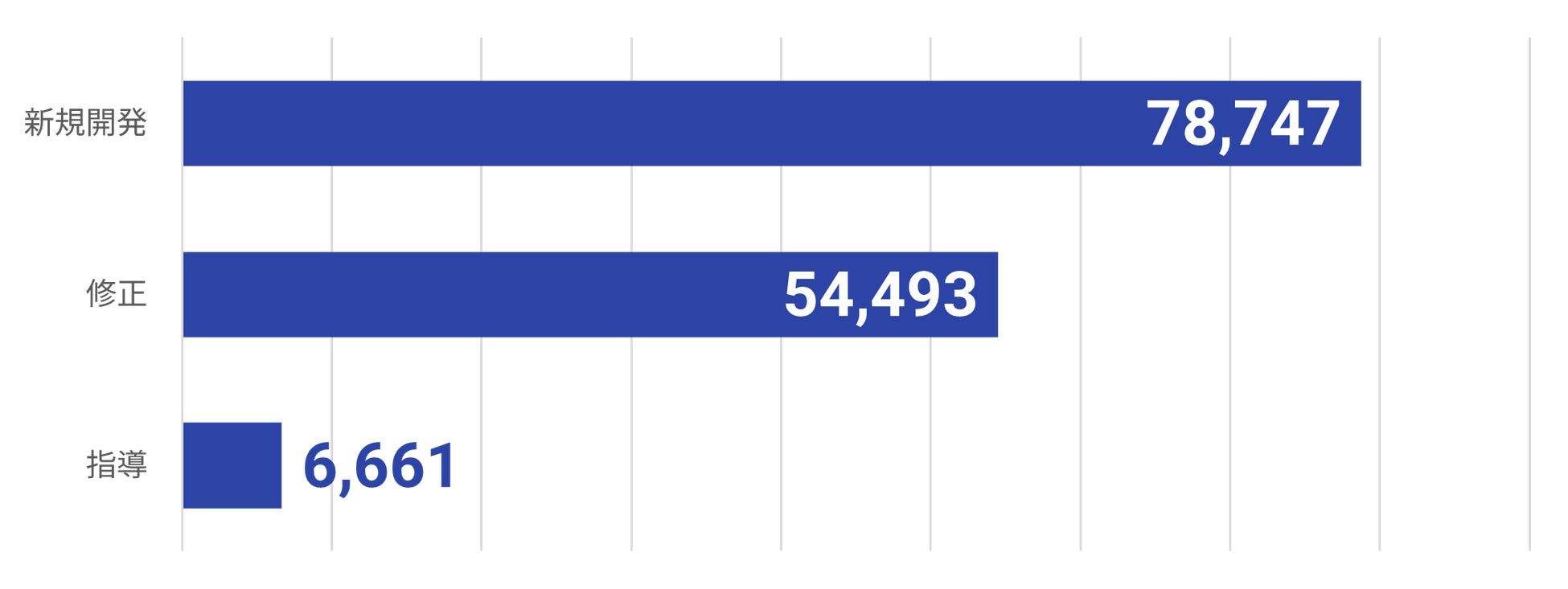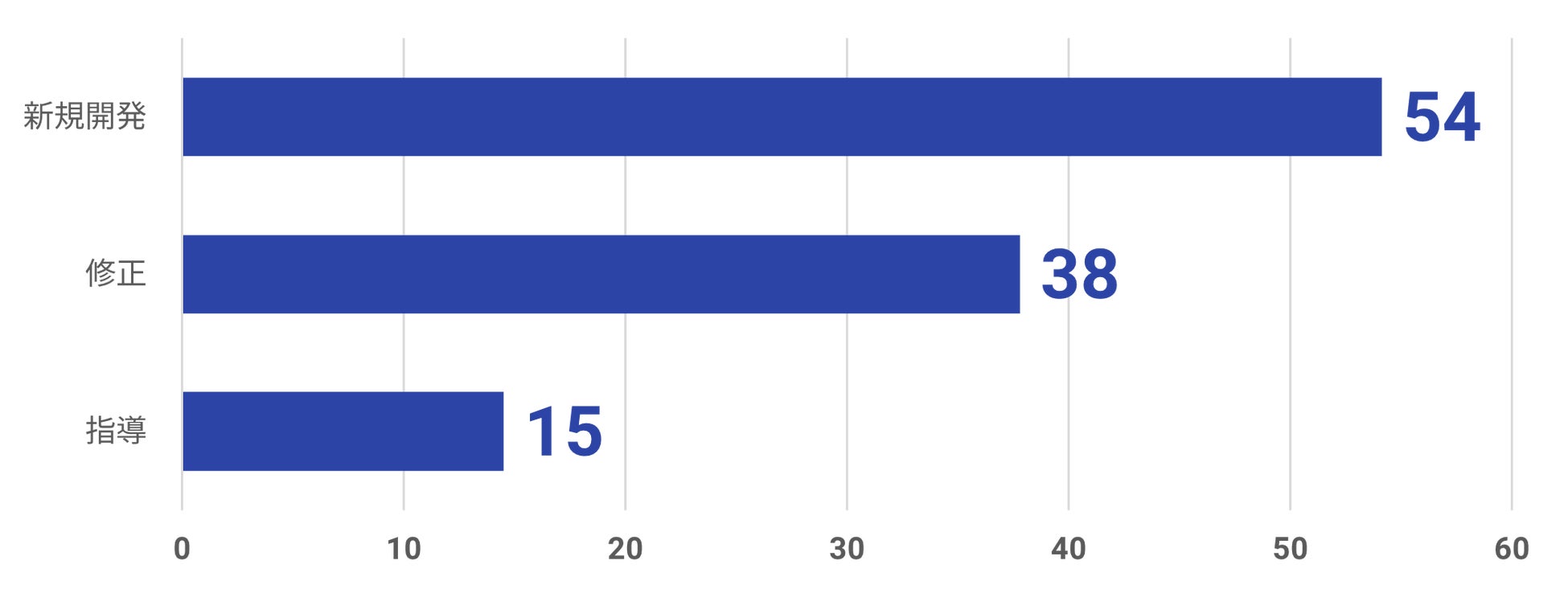 最後に、ご依頼から完了までの日数です。こちらもやはり新規開発が最も長く54日で、次いで修正が38日となりました。新規もしくは修正の場合は、1ヵ月から2ヵ月で納品が完了しているということになります。指導サービスはご依頼後に日程調整を行い、複数回にわたるケースもあるため、平均では完了まで15日となっています。