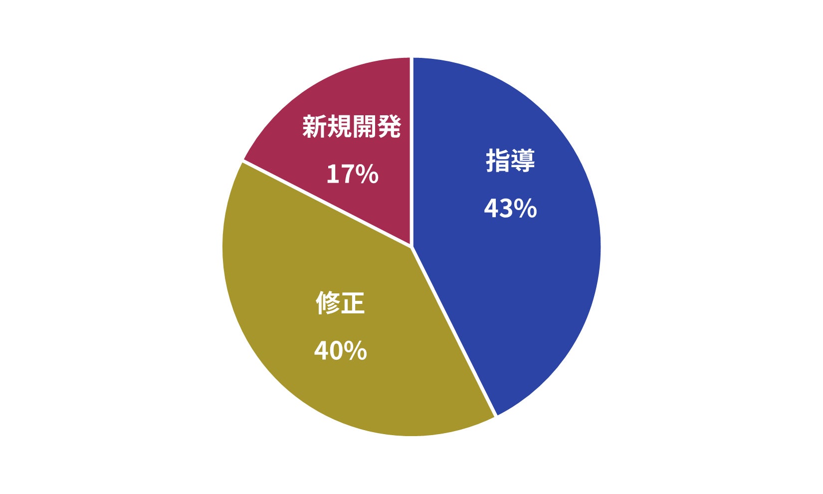 サービス別の構成比については、指導サービスが43%と最も多く、次に修正サービスが40%、新規開発が17%となりました。Accessに関するサービスというと新規開発が最も多いとイメージされるかもしれませんが、実際にはすでにAccessで運用されている業務が多く、もともとの開発者が異動や退職により不在となり修正ができないという問題を抱えている職場が多いのが現実です。