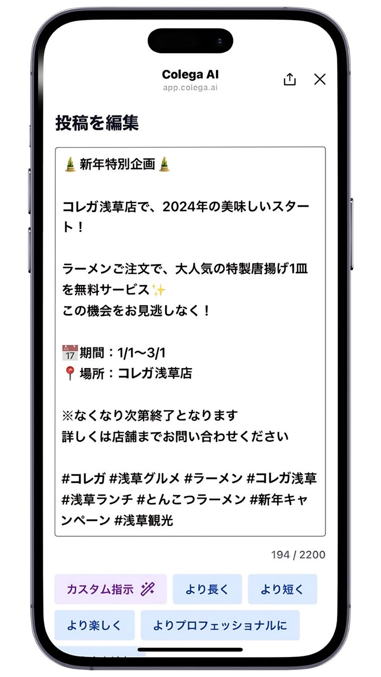 Colega AI株式会社では、飲食店オーナーが抱えるSNS運用における課題を解決するため、飲食店スタッフや飲食店の販促チームが撮影・用意した商品画像や店舗画像を、飲食店向けAIソリューションサービス「Colega AI」に投稿するだけで、画像をもとにした文章とハッシュタグを自動生成すると共に、店舗が運営する複数のSNSに多言語で投稿を行うことで、コンテンツ制作や投稿に係る手間を大幅に削減できるほか、増加する訪日外国人に対しても、日本語以外での集客を可能とします。