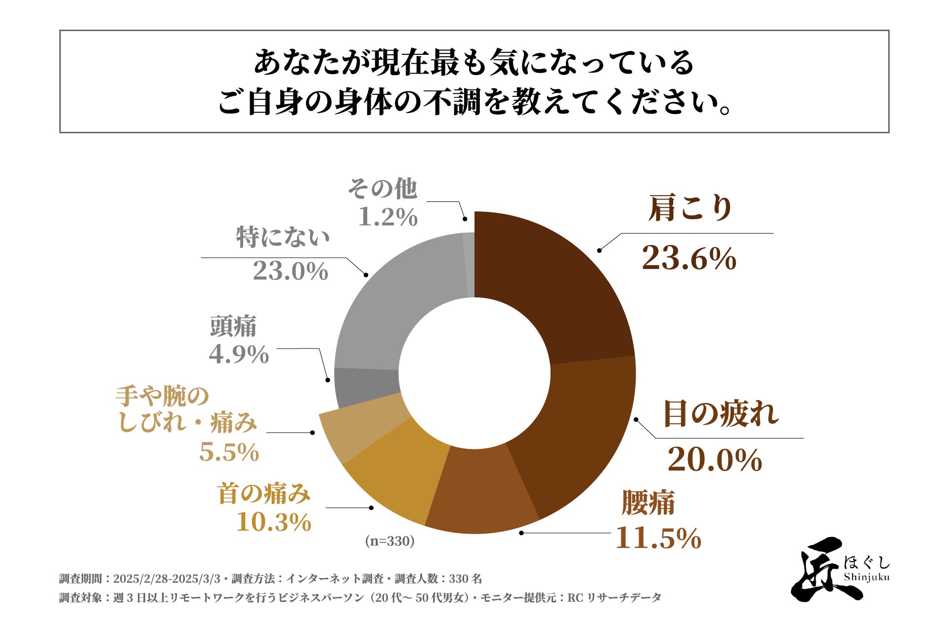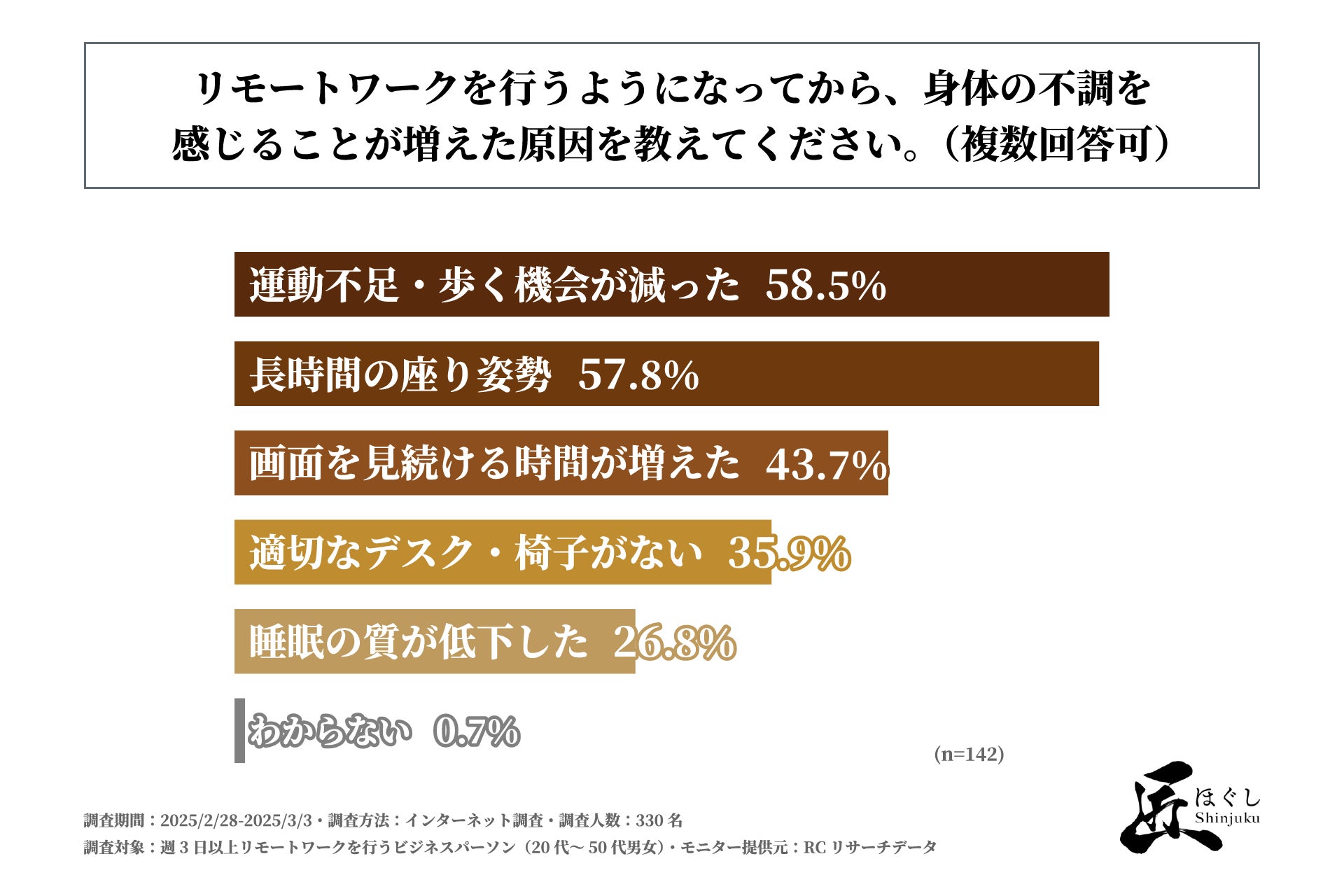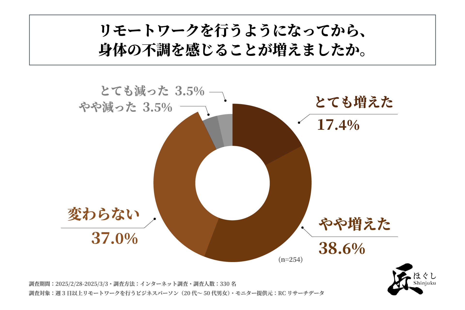 コロナ禍を経て、リモートワークが定着した今、私たちの働き方だけでなく、健康への影響も大きく変化しています。通勤時間がなくなり、自宅やカフェなど自由な場所で働ける一方で、長時間の座り姿勢や運動不足により、肩こりや腰痛といった身体の不調を訴える人が増えています。実際に、そういった作業環境はオフィスと異なり、適切なデスクや椅子が揃っていないケースも多く、姿勢の崩れや筋肉の緊張が慢性化しやすいと考えられます。そこで今回、「匠ほぐしShinjuku」は、リモートワークを行うビジネスパーソンを対象に「リモートワーカーの健康意識と身体の不調」に関する実態調査を実施しました。