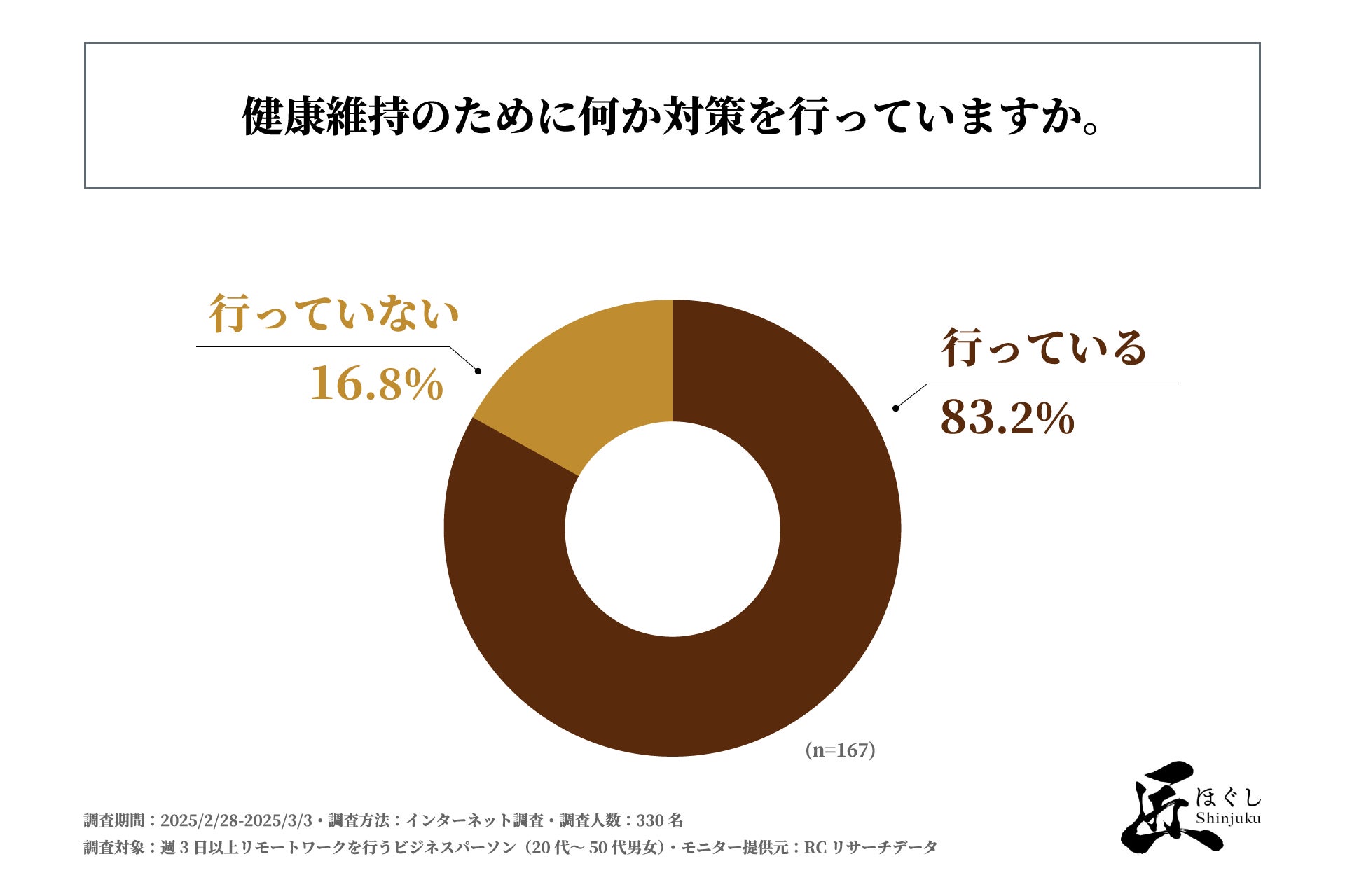 次に、リモートワークを始めてから、健康維持に対する意識が高まったと回答された方に、「健康維持のために何か対策を行っているか」を尋ねる設問への回答では、「行っている」が83.3%、「行っていない」が16.8%という結果になりました。この結果から、リモートワークを始めてから、健康維持に対する意識が高まったビジネスパーソンの大半が、健康維持のための対策を行っていることが明らかになりました。