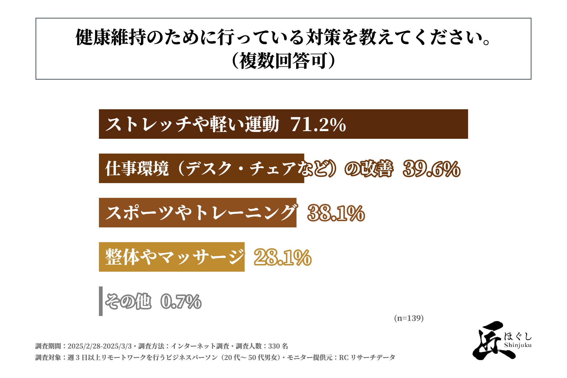 調査の最後、健康維持のために何か対策を行っていないと回答された方に「健康維持のために行ってみたい対策」を尋ねる設問の回答では、1位が「ストレッチや軽い運動」で64.3%、2位が「仕事環境(デスクやチェアなど)の改善」で46.4%、3位が「整体やマッサージ」で28.6%という結果になりました。この設問でも、身体を動かす機会が減っていることを気遣うような回答が上位に並ぶ結果となりました。