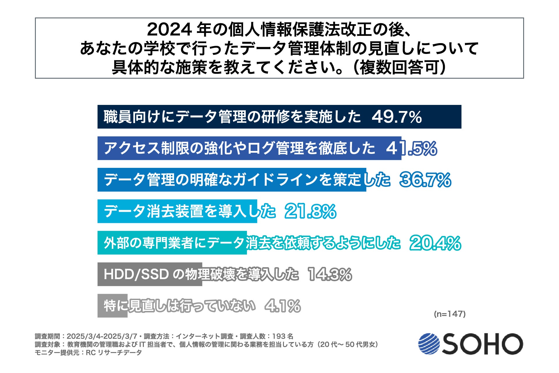 今回の調査により、教育機関の管理職およびIT担当者で、個人情報の管理に関わる業務を担当する人の8割以上が、2024年の個人情報保護法改正により、学校における個人情報管理の意識が高まったと感じており、実際に2024年の個人情報保護法改正の後、8割弱の学校でデータ管理体制の見直しが行われたことが明らかになりました。また、2024年の個人情報保護法改正の後、学校で行われたデータ管理体制の見直しの具体的な施策トップ3は、1位「職員向けのデータ管理研修の実施」、2位「アクセス制限の強化やログ管理の徹底」、3位「データ管理の明確なガイドラインの策定」であり、2024年の個人情報保護法改正の後、データ管理に関して直面している主な課題は「教職員への情報共有ができていないこと」や「データ管理に関する知識が追いつかないこと」であることがわかりました。尚、現在、多くの学校で不要になった個人情報は「PCなどで手動で消去」されており、今後、データ管理や消去に関して強化したいと思う点は、教職員への研修、データ管理の明確なガイドライン策定、HDD/SSDの物理破壊装置やデータ消去装置の導入であることが判明しました。