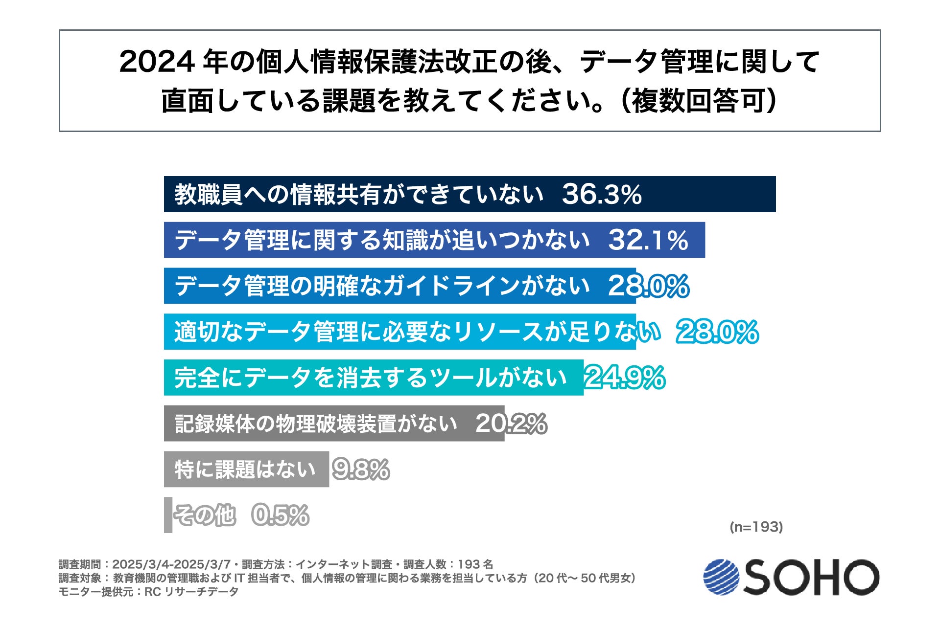 2024年の個人情報保護法改正の後、データ管理に関して直面している主な課題は「教職員への情報共有ができていないこと」や「データ管理に関する知識が追いつかないこと」