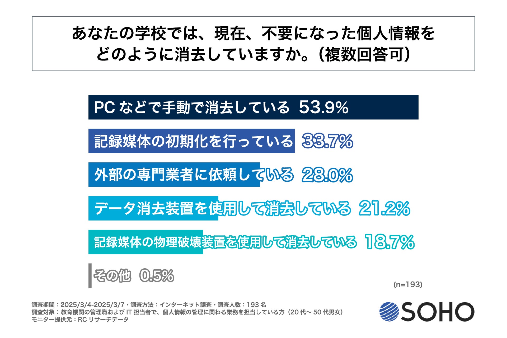 また、「あなたの学校では、現在、不要になった個人情報をどのように消去しているか」を尋ねる設問の回答では、1位が「PCなどで手動で消去している」で53.9%、2位が「記録媒体の初期化を行っている」で33.7%、3位が「外部の専門業者に依頼している」で28.0%という結果になりました。この結果から、不要になった個人情報は「PCなどで手動で消去している」学校が多いことが明らかになりました。