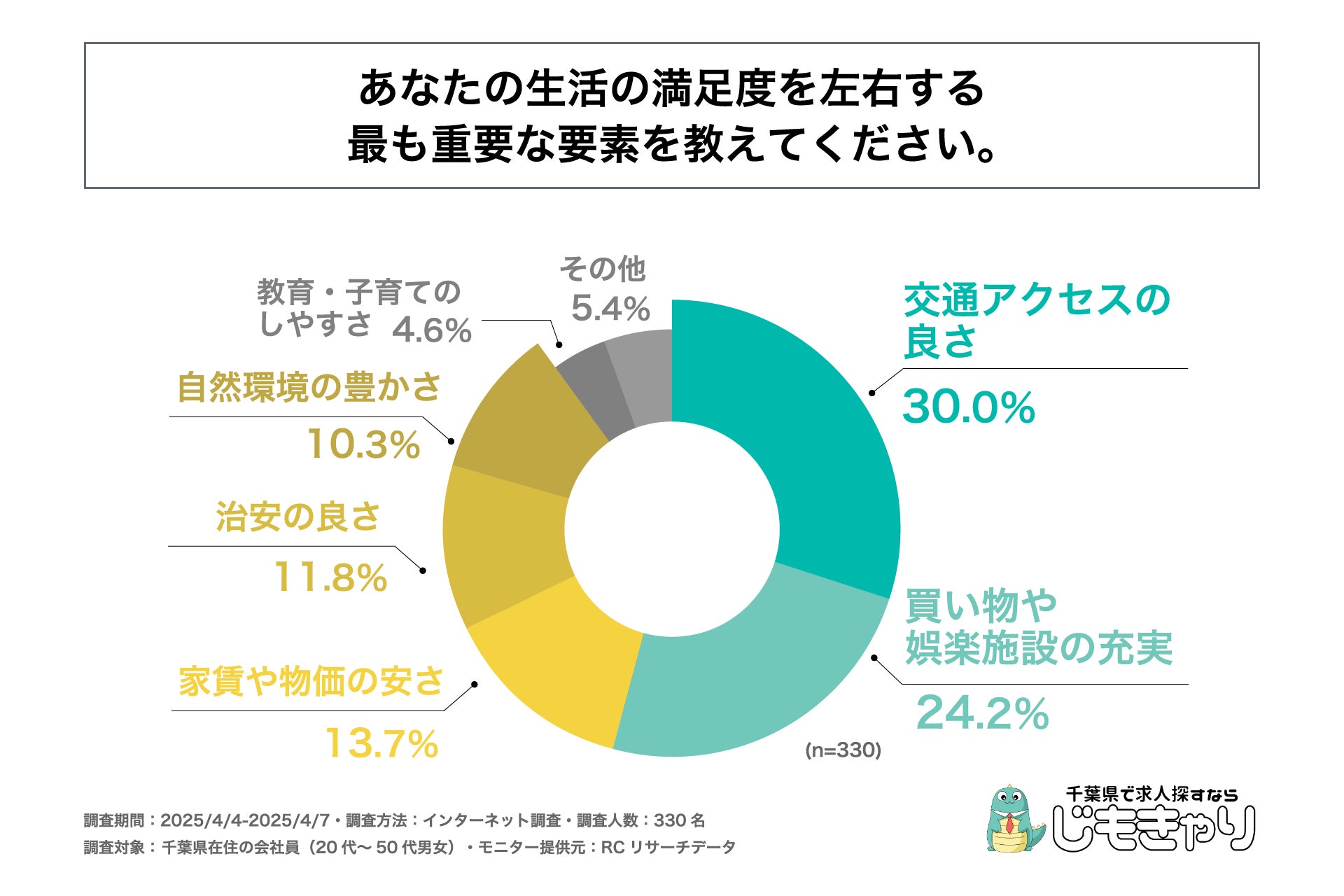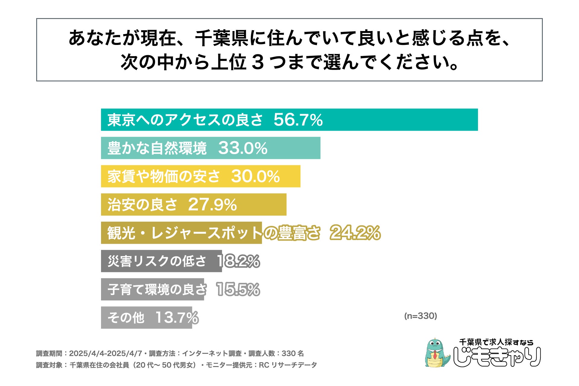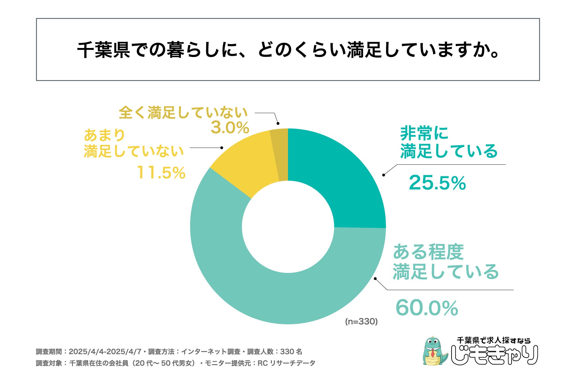 近年、働き方の多様化やテレワークの浸透、地方移住への関心の高まりなどを背景に、「どこで暮らすか」がより重要な選択肢となりつつあります。中でも首都圏に位置しながら、自然と都市機能がバランスよく共存する千葉県は、通勤・子育て・住環境といった多角的な視点から注目されるエリアのひとつです。そこで今回、「じもきゃり」は、千葉県在住の会社員を対象に、「千葉県での暮らしの満足度と魅力に関する意識調査」を実施しました。