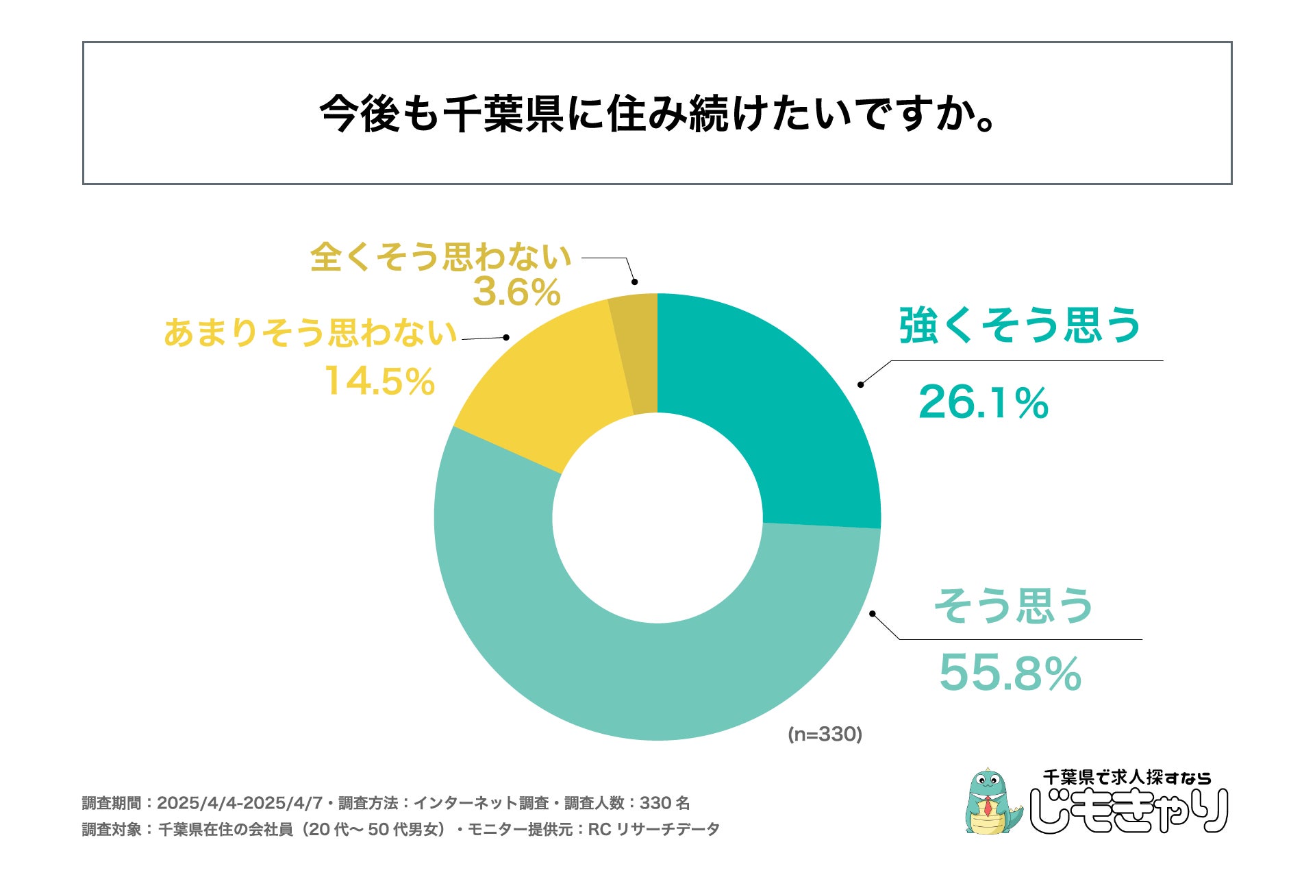 調査の最後、「今後も千葉県に住み続けたいか」を尋ねる設問の回答では、1位が「そう思う」で55.8%、2位が「強くそう思う」で26.1%、3位が「あまりそう思わない」で14.5%という結果になりました。1位と2位の回答を合計すると回答率80%を超える形となり、この結果から、千葉県在住の20代~50代の会社員の8割以上が、今後も千葉県に住み続けたいと考えていることが明らかになりました。