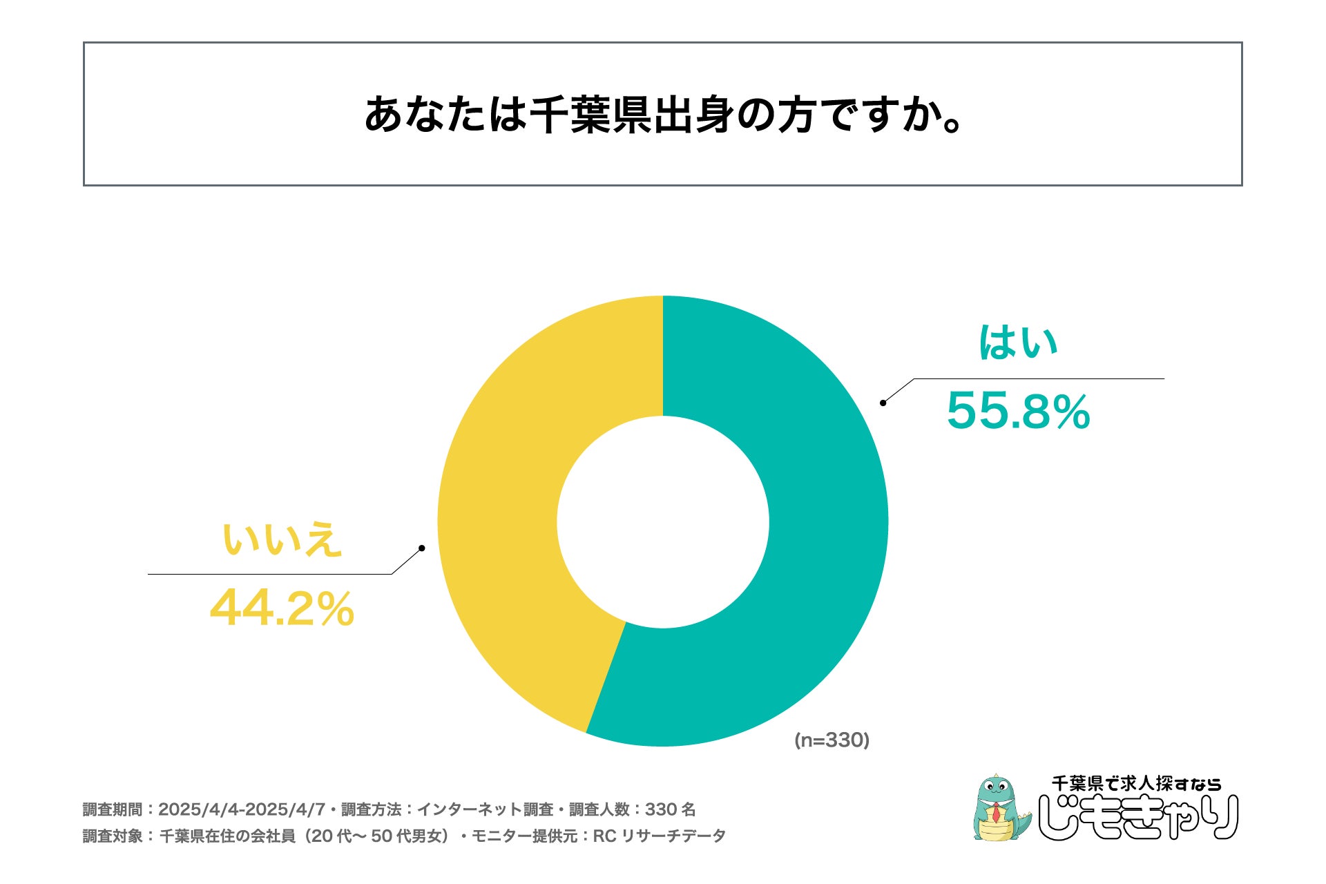 まず、「千葉県出身か」を問う設問への回答では「はい」が55.8%、「いいえ」が44.2%という結果になりました。この結果から、千葉県在住の20代~50代の会社員の半数以上が千葉県出身であることがわかりました。