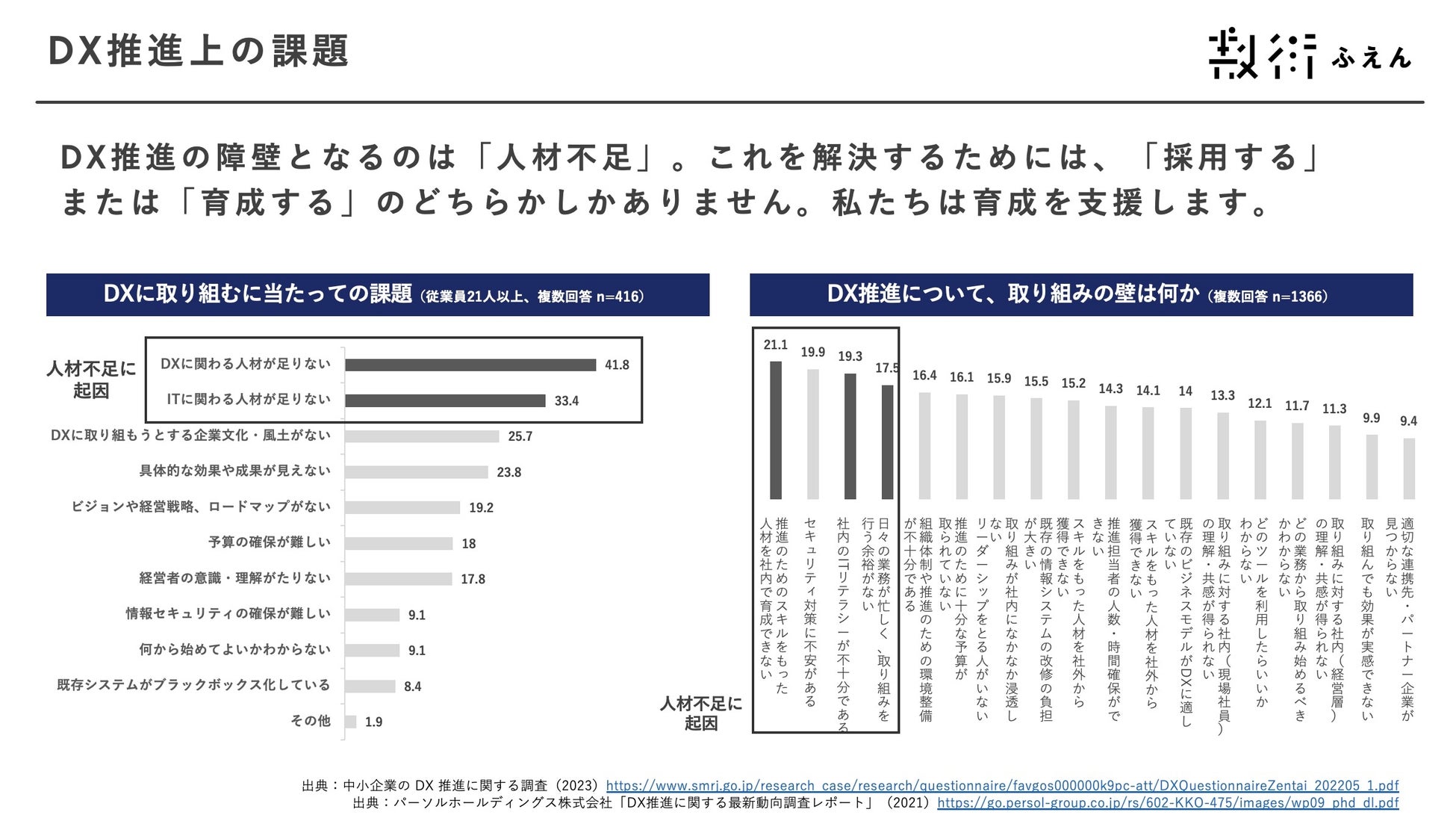 こうした課題に対し、ふえんは「ノーコード」と「市民開発」に着目。事業部門とDX推進部門が連携し、投資対効果が明確なDXを実践するための知見とノウハウを提供します。市民開発を体系的に学べる研修プログラムはほとんど存在せず、企業が独自に取り組むのは困難です。ふえんは、ノーコードを活用した市民開発がDX推進の鍵と考え、本研修を通じて企業のDXを支援します。