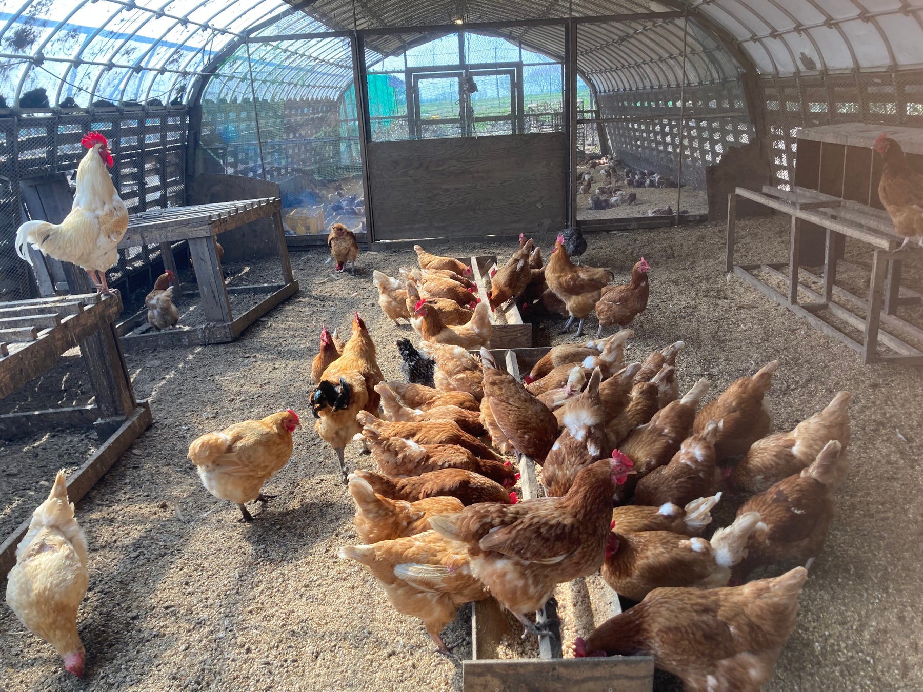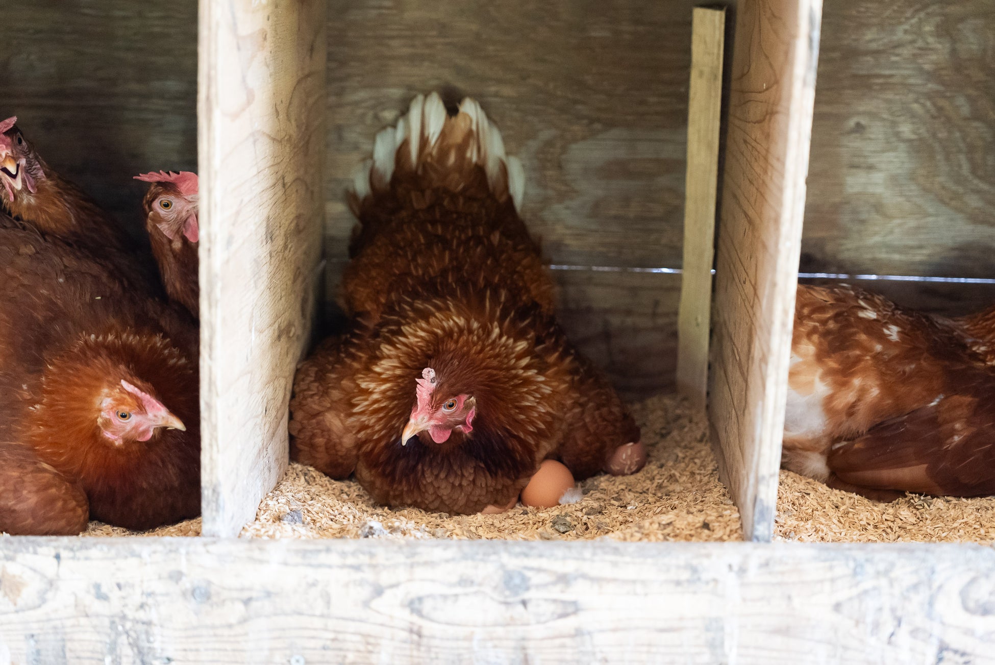 当養鶏場では、約1,500羽の採卵鶏が屋内外を自由に行き来できる平飼い方式を採用しています。国内では9割以上の養鶏場がケージ飼いを行う中、私たちは鶏本来の行動を尊重した飼育環境を整備した、平飼い養鶏を行なっています。