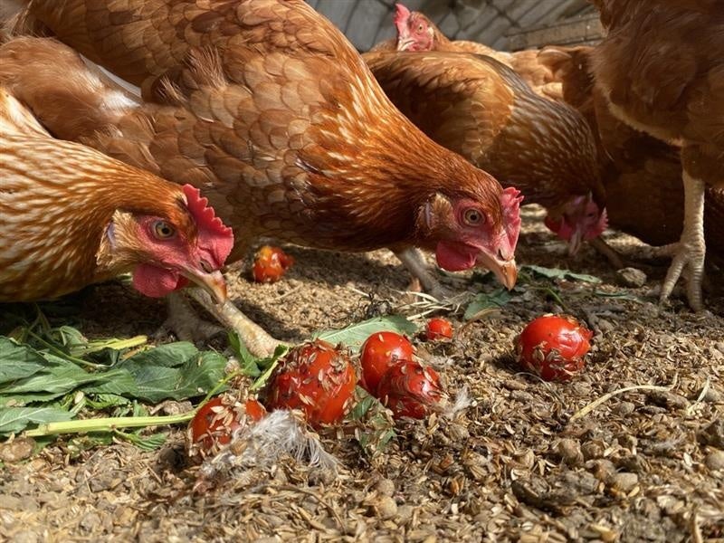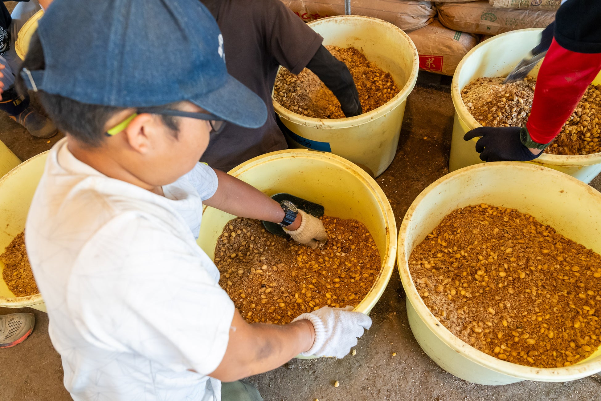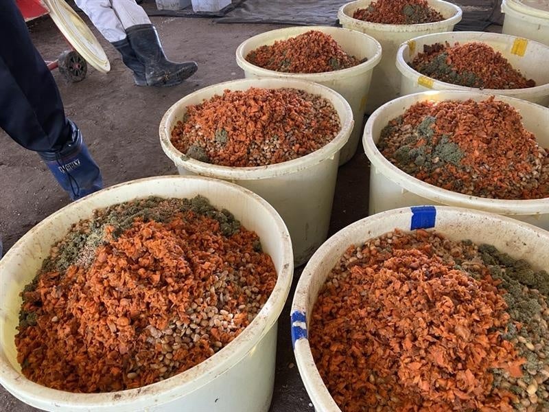 餌づくりも重視しており、毎朝大豆を炊くところから始まり、12種類の材料(麦、米ぬか、子実トウモロコシ、ワインかす、麦芽、ふすま、コーン、魚粉、牡蠣殻、石灰岩、塩、ホップかす)を独自の配合で混ぜ合わせています。大豆と麦は人間の食用には適わない規格外や等級外のものを使用し、ワインの搾りかすや麦芽、ホップの搾りかすは、市内のワイナリーやブルワリーから出る醸造副産物を無料で譲り受けています。このように地域の資源を有効活用することで、環境負荷の低減にも貢献しています。