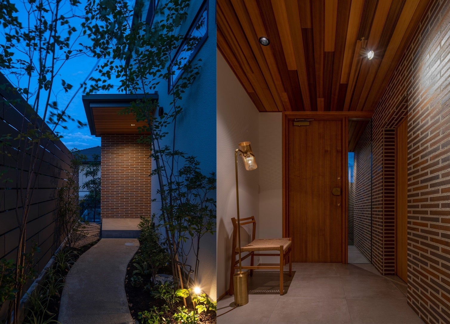この住宅は、洗練されたデザインの中に温かみとプライバシーを優雅に調和させた点が高く評価されました。エントランスポーチからホールへと続くタイル張りの壁が、空間に一体感をもたらし、自然で心地よい動線を形成しています。また、最小限の窓でありながら、計算された照明配置によって明るく開放的な雰囲気を生み出している点も印象的でした。