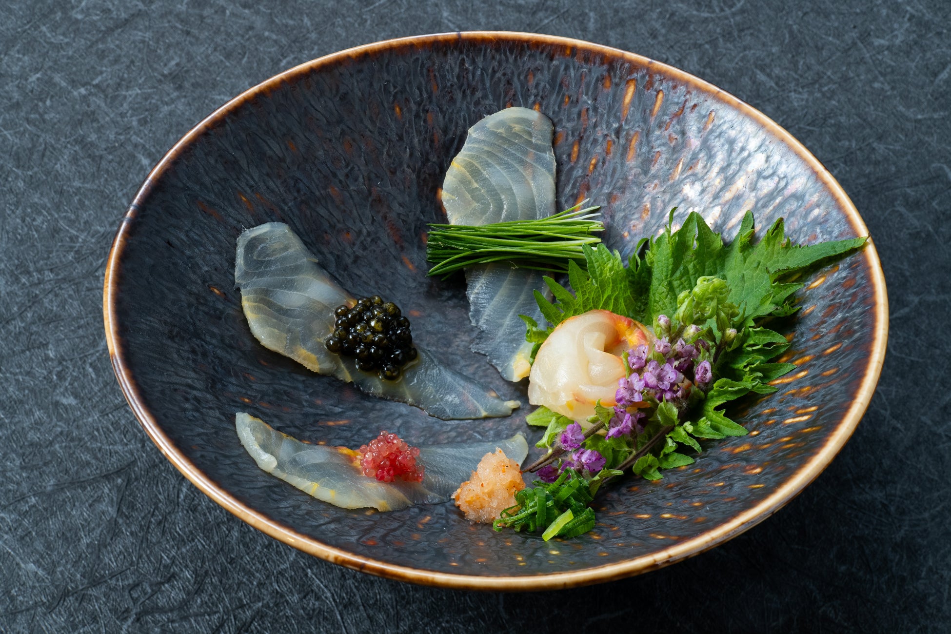 ・チョウザメのお造り:クセもなくコリコリの食感を楽しんでいただくために、あえてシンプルなお造りに仕上げました。食感の違う様々なあしらえと共にお召し上がりください。