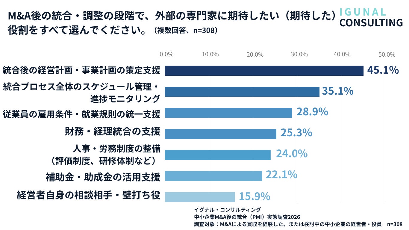 外部の専門家に期待する役割としては、「統合後の経営計画・事業計画の策定支援」(45.1%)がトップ、次いで「統合プロセス全体のスケジュール管理・進捗モニタリング」(35.1%)が続きました。「従業員の雇用条件・就業規則の統一支援」(28.9%)、「人事・労務制度の整備」(24.0%)といった人事・労務領域も2〜3割の経営者が期待しています。これらは、税理士・会計士・弁護士の通常の業務範囲を超えた、経営・組織コンサルティング領域の支援ニーズが存在することを示しています。