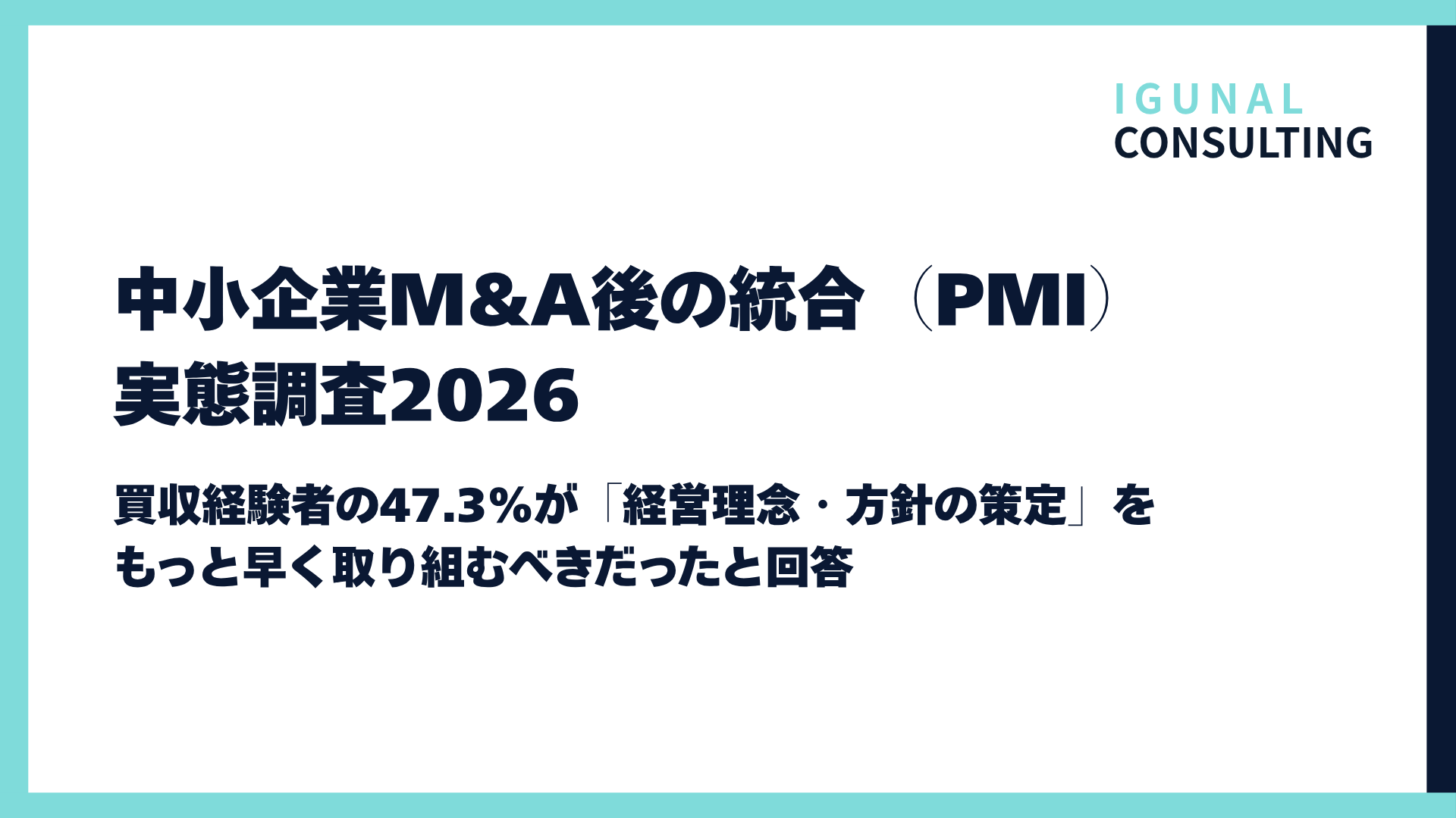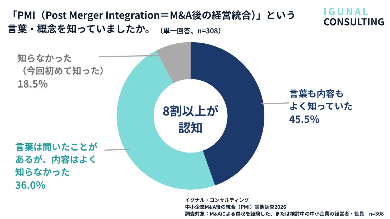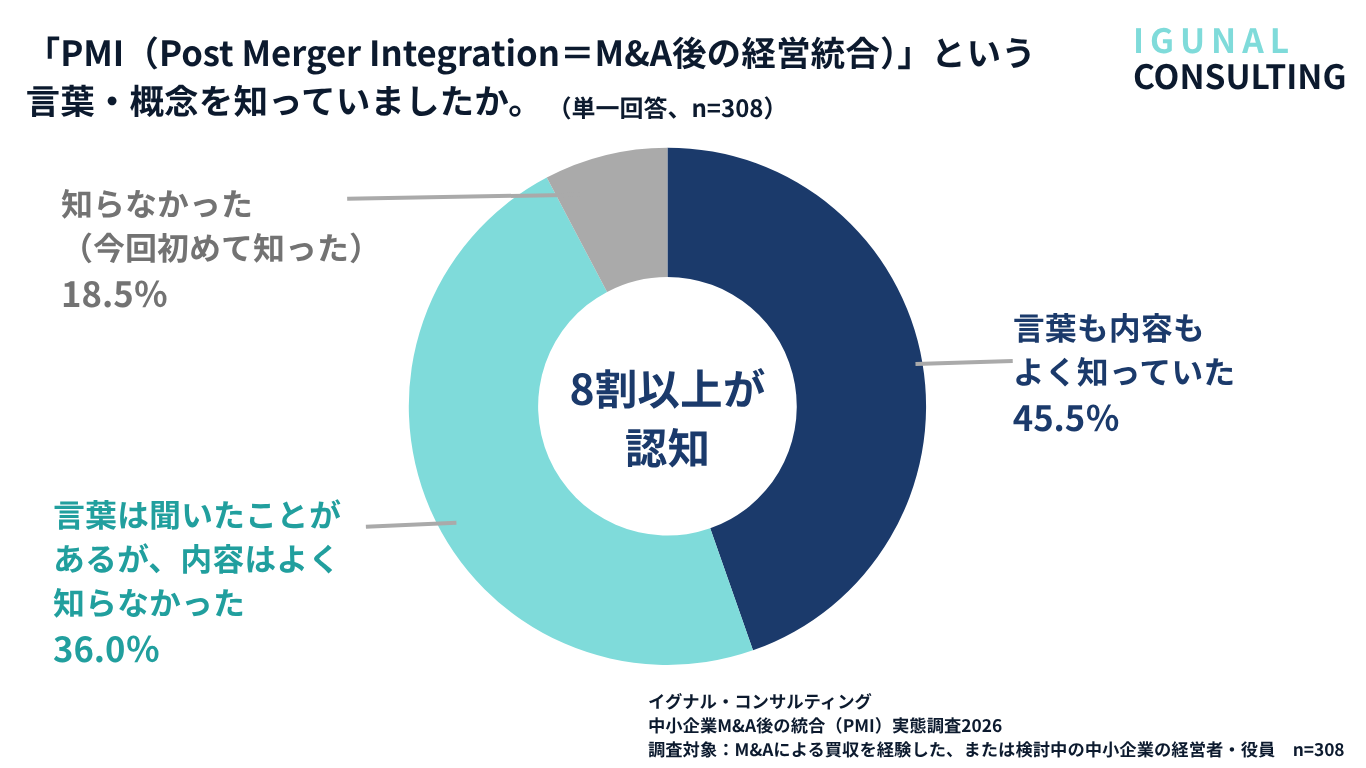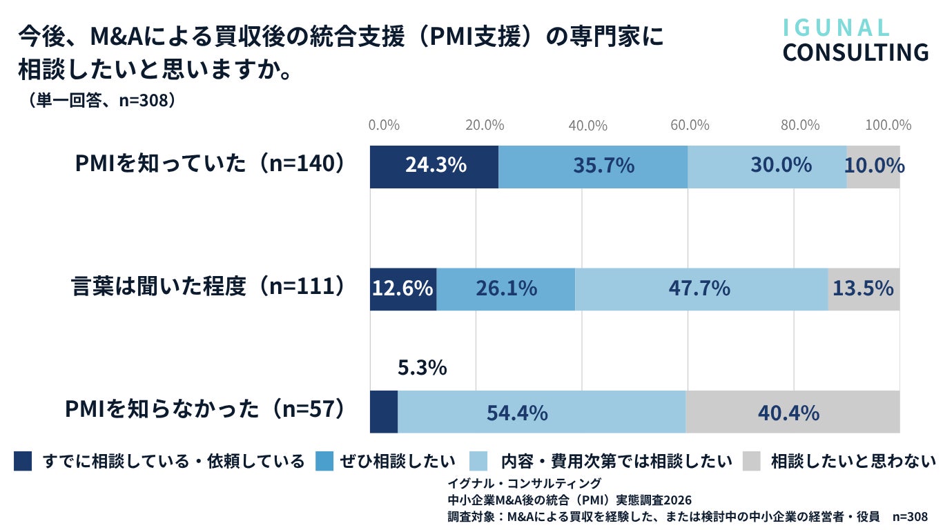 イグナル・コンサルティング(三重県鈴鹿市、代表:林 早苗、中小企業診断士)は、M&Aによる企業・事業の買収を経験した、または検討中の中小企業の経営者・役員308名を対象に、M&A後の統合プロセス(PMI:Post Merger Integration)の実態について調査を実施しました。