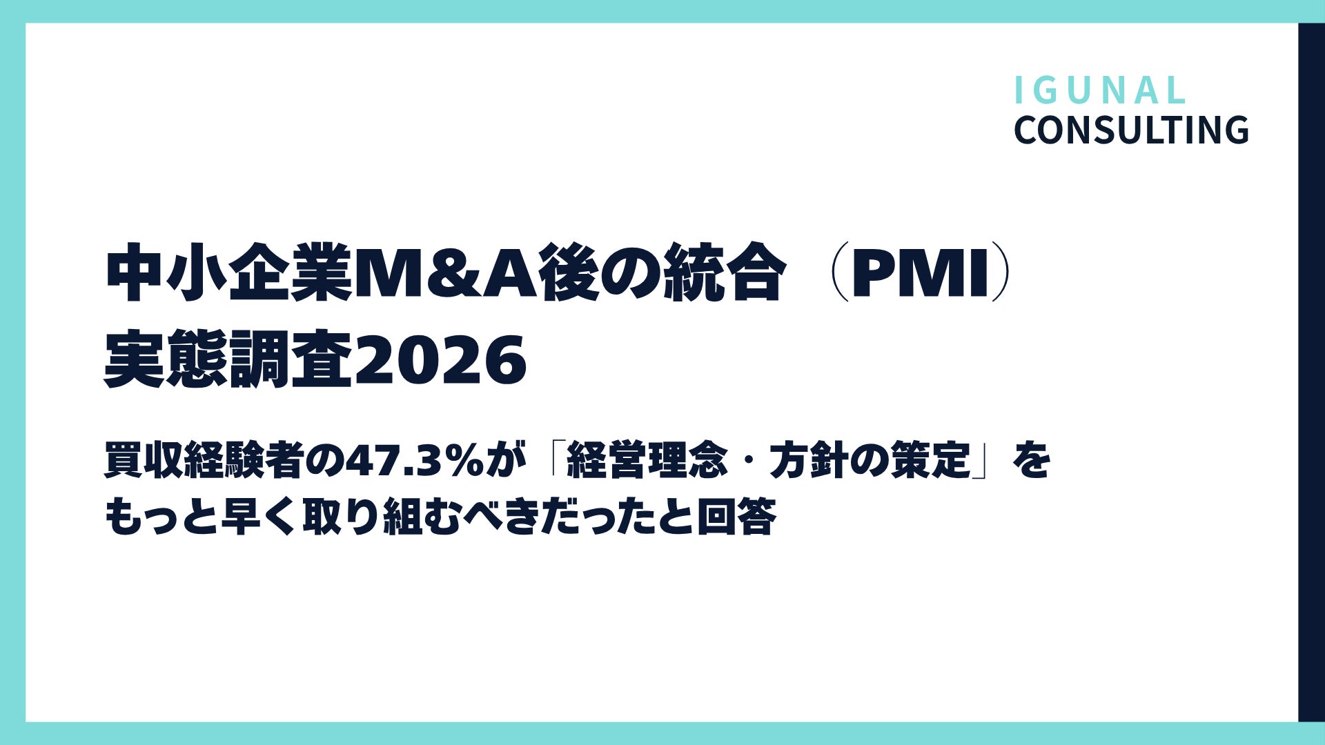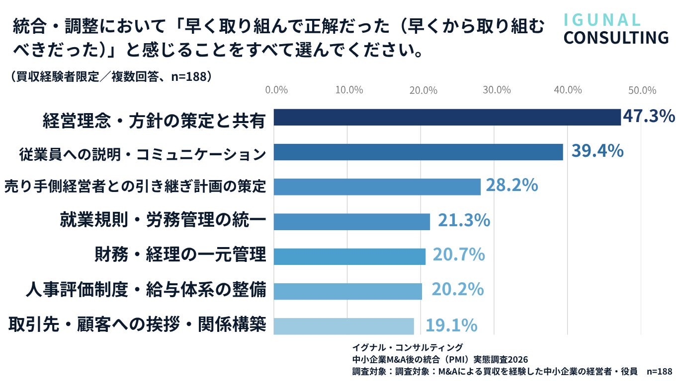 【調査】M&A買収経験者の47.3%が「経営理念・方針の策定と共有」をもっと早く取り組むべきだったと回答|中小企業M&A後の統合(PMI)実態調査2026