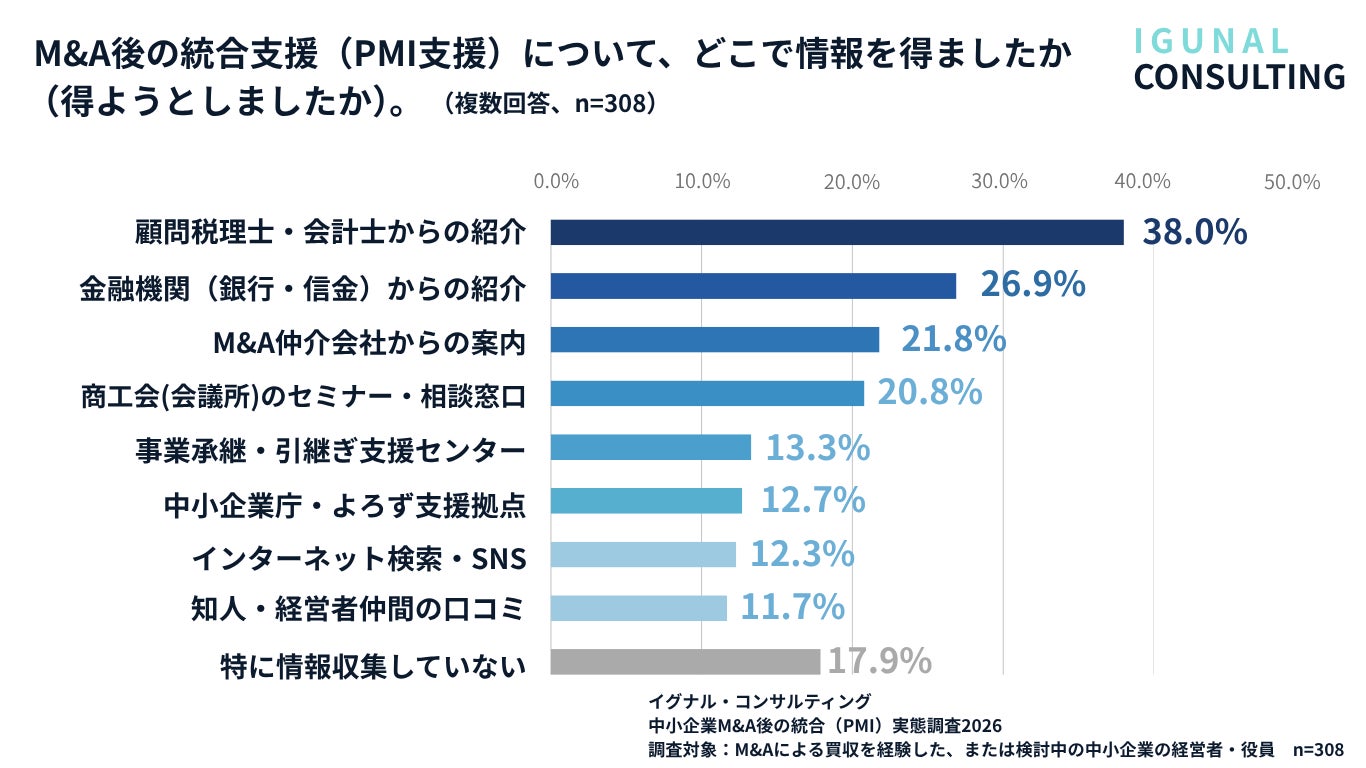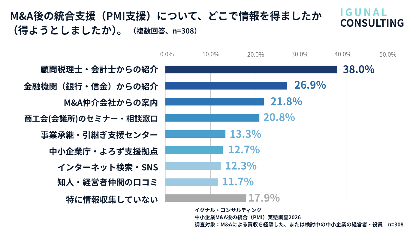 PMI支援の情報源は「顧問税理士・会計士からの紹介」(38.0%)がトップ。中小企業診断士・社会保険労務士など組織・労務分野の専門家への直接的な情報経路は限定的