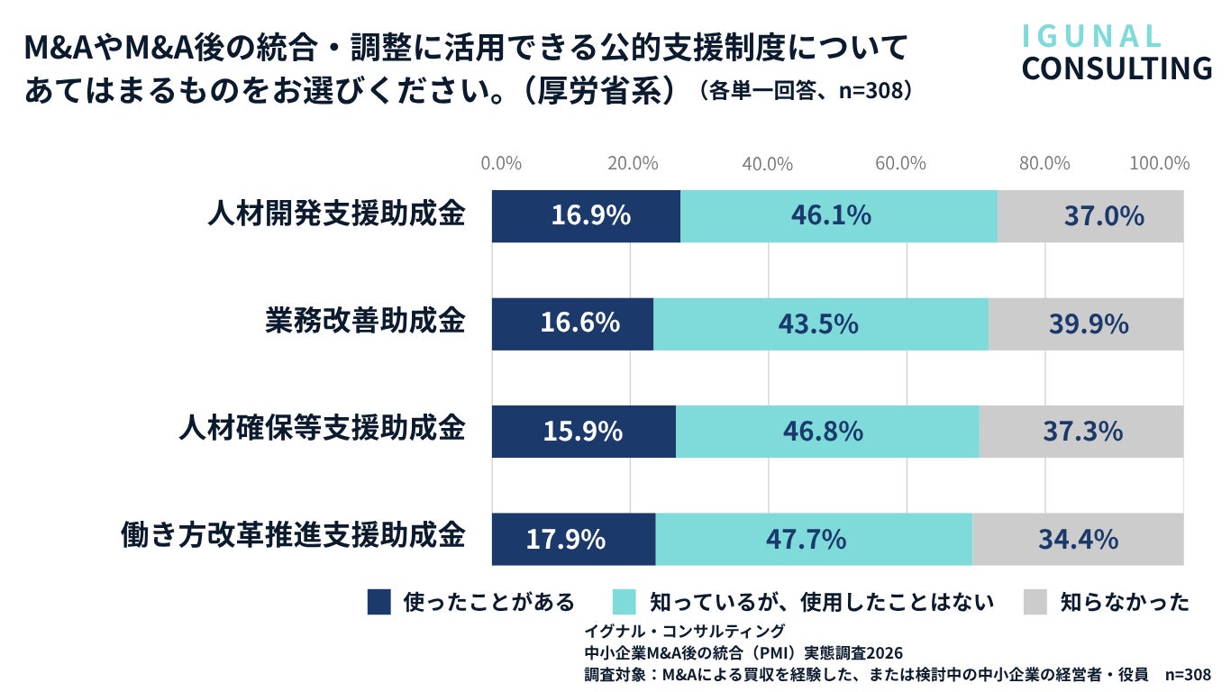 中小企業庁系・厚労省系のいずれの公的支援制度についても、「存在は知っているが、使用したことはない」が43〜48%と最大ボリュームを占めました。とくに厚労省系の助成金は活用率が15〜17%台にとどまっており、認知から活用までの間に大きなギャップがあります。事業承継・M&A補助金(活用27.3%)など中小企業庁系は比較的活用率が高い一方、組織・労務面で活用余地のある厚労省系助成金は、PMIの文脈でほとんど認識されていない可能性があります。