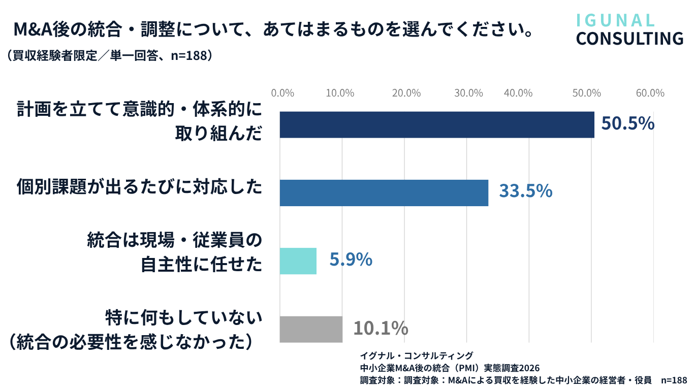 M&Aによる買収を経験した中小企業経営者のうち、「計画を立てて意識的・体系的に統合に取り組んだ」と回答したのは50.5%にとどまりました。残る半数は、課題が出るたびに個別対応(33.5%)、現場任せ(5.9%)、特に何もしていない(10.1%)と回答しており、計画的・体系的なPMIに取り組めていない実態が明らかになりました。中小PMIガイドラインが推奨する「統合方針の事前策定」が、現場ではまだ浸透の途上にあることが示唆されます。